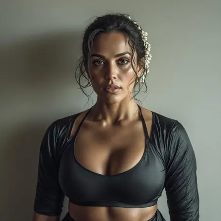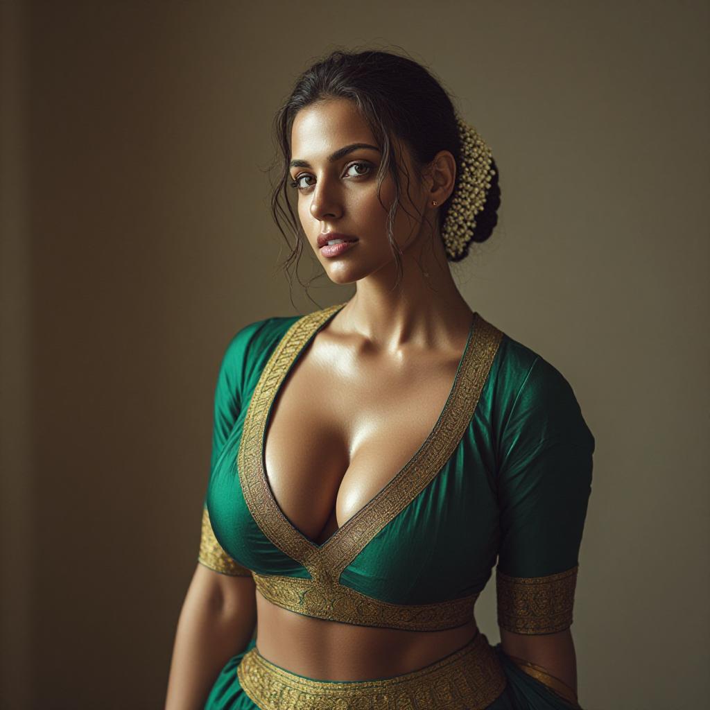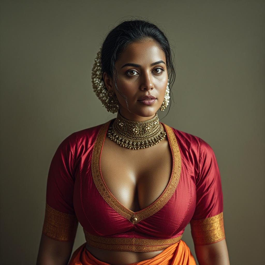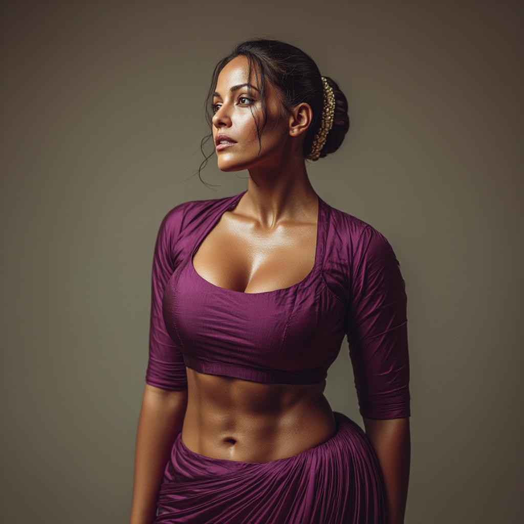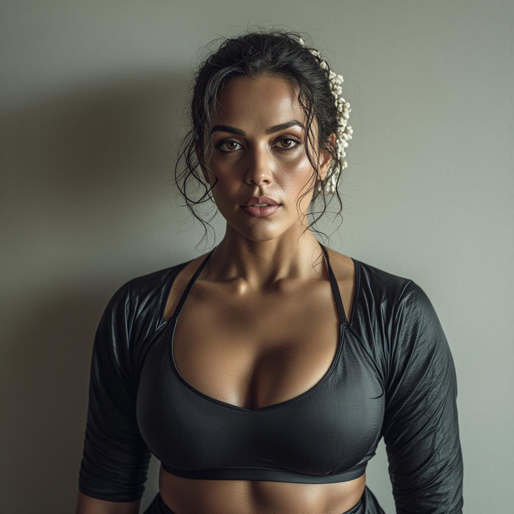 スタジオ照明下で、ガルジャの花のアクセサリーを髪に飾り、茶色の肌をした女性の現実的な上半身ポートレートを生成するためのLoRA。