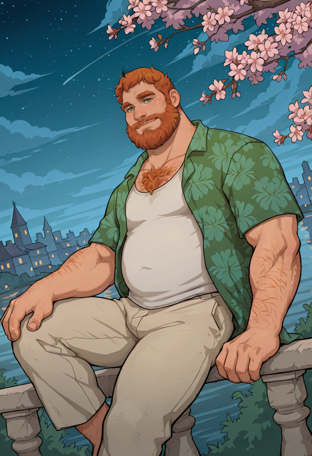 green hawaiian shirt, white tank top,  khaki pants,