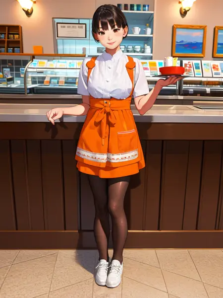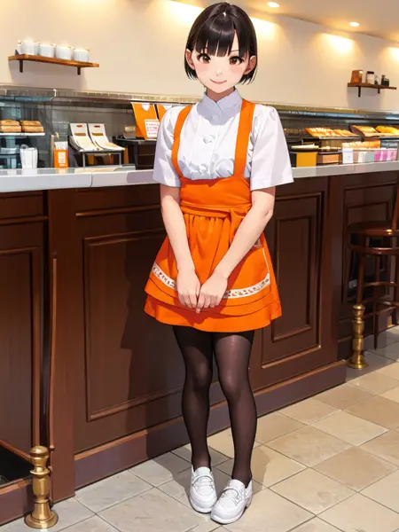 AMTS, AMSC, 1girl, solo, realistic, pantyhose, brown hair, food, waitress, menu, smile, orange skirt, orange apron, uniform, looking at viewer, indoors, restaurant,** shop, tile floor,