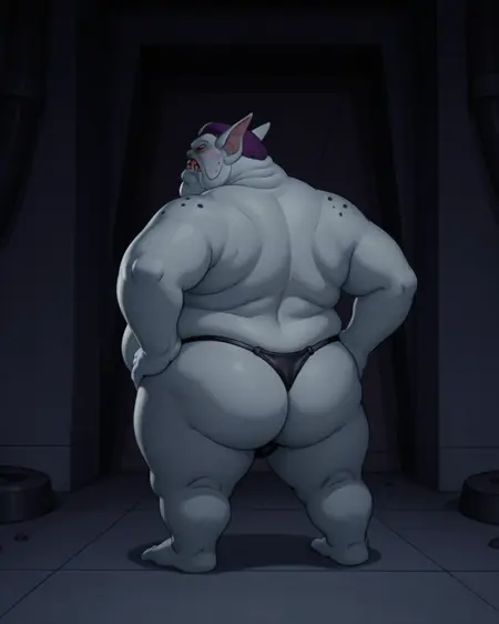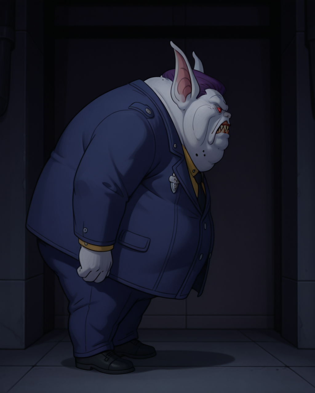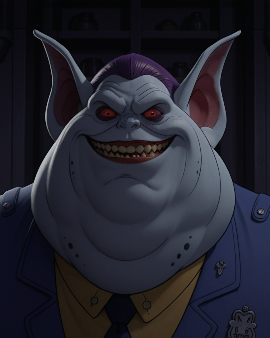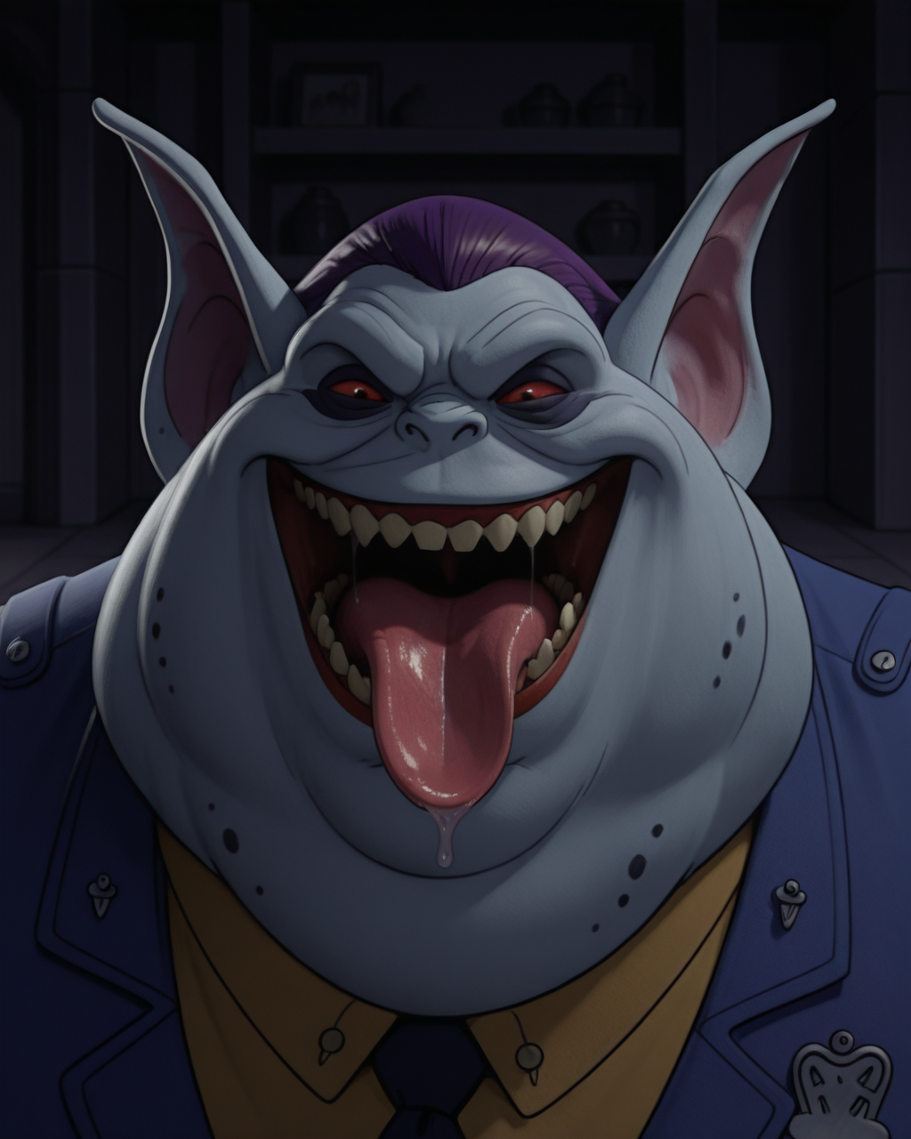 no human, monster, pale skin, sharp teeth, red eyes, red lips, short hair, purple hair, protruding ears, fat, bbw, blue jacket, blue pants, black shoes,