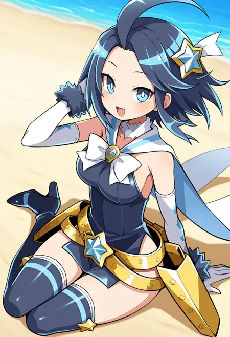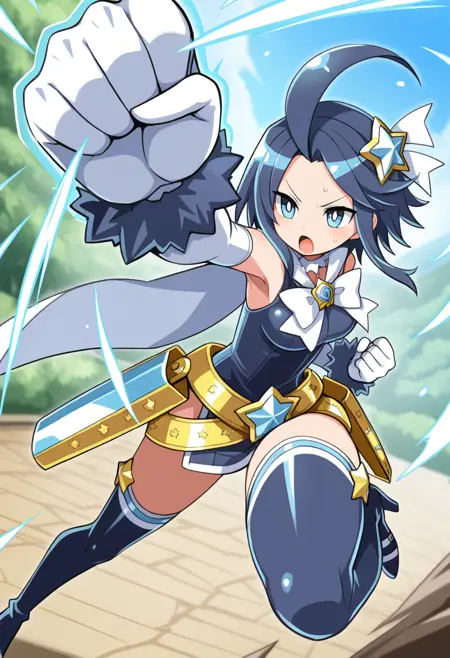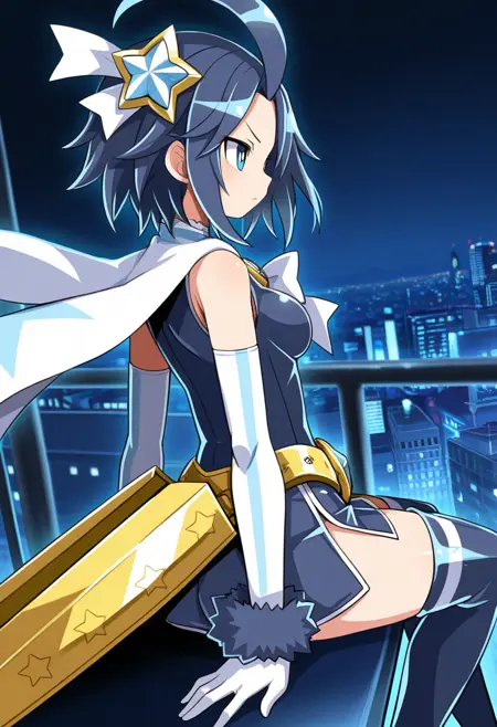 • magical girl costume, star hair ornament, white cape, white bowtie, brooch, dark blue dress, microdress, side slit, white elbow gloves, fur wrist cuffs, star \(symbol\), gold belt, faulds, dark blue thigh boots, high heel boots,
