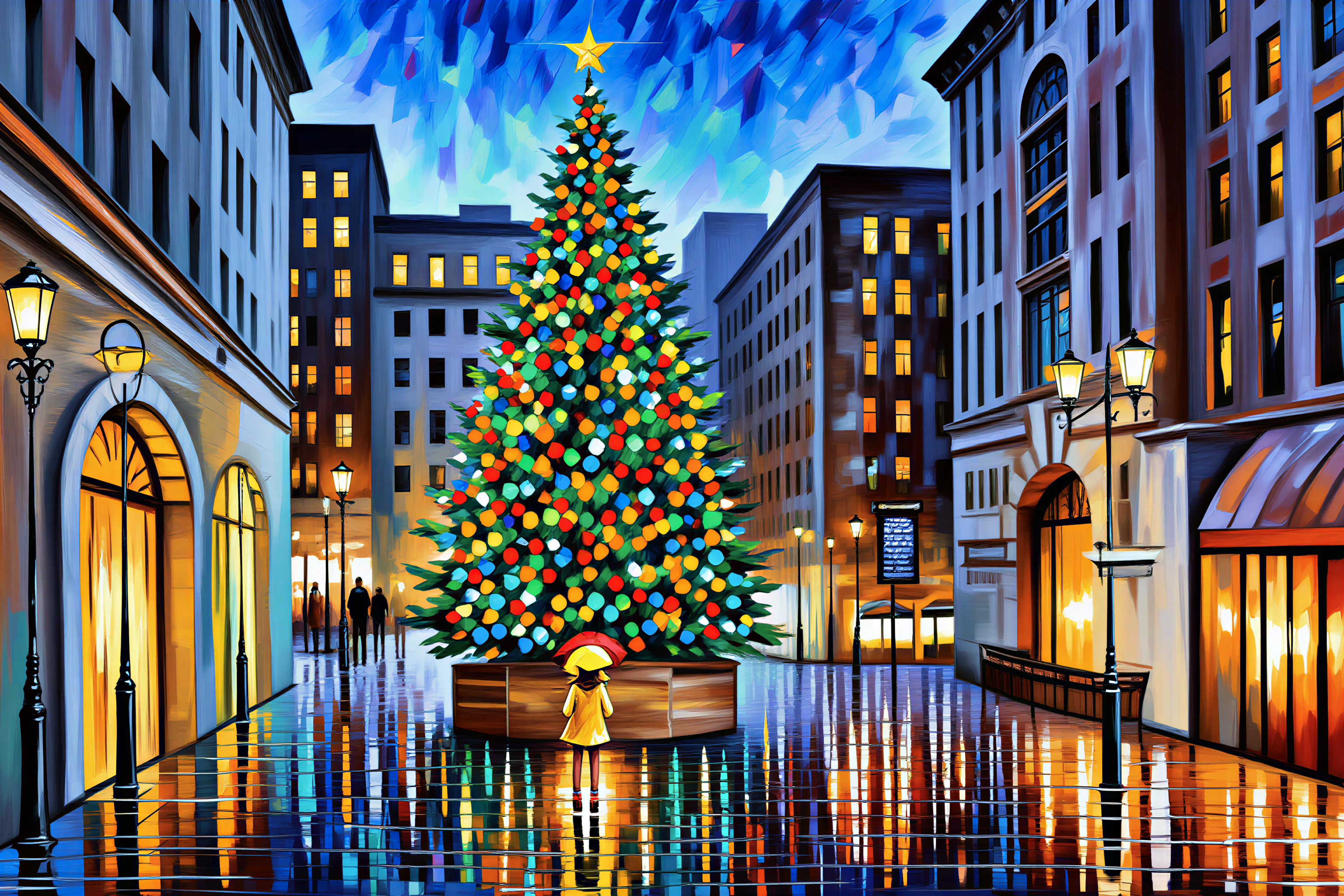 "The trees are lit up with colorful lights, creating a rainbow-like effect."