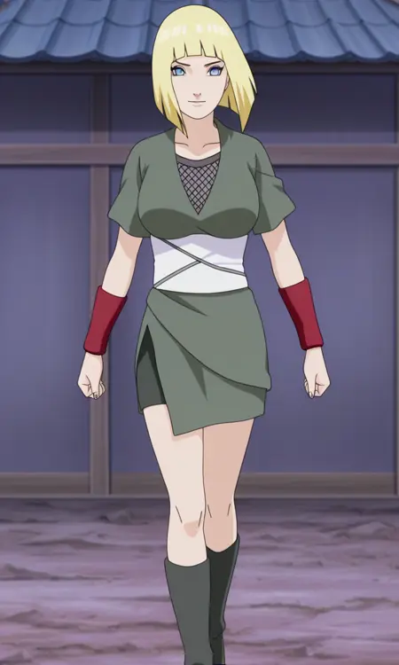 サムイ、1人女の子、シングル、金髪、短髪、ボブカット、ストレート前髪、青い目、忍者、緑のドレス、フィッシュネットトップ、胸元、短い袖、白い帯、赤い手首カフス、非対称なドレス、濃いグレーのスカート、膝丈ブーツ、つま先なし履物、濃いグレーの履物、