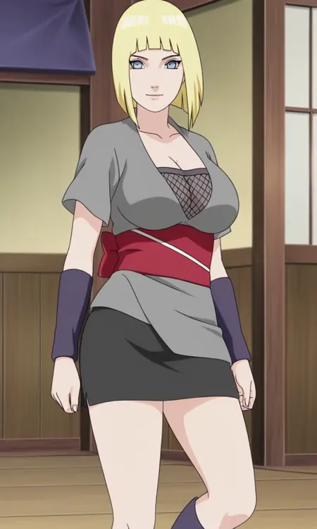 サムイ、1人女の子、シングル、金髪、短髪、ボブカット、ストレート前髪、青い目、忍者、グレーの着物、フィッシュネットトップ、胸元、短い袖、帯、黒いスカート、アームウォーマー、つま先なし履物