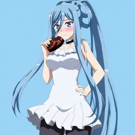 takao \(arpeggio\), light blue hair, long hair, hair rings, ponytail, hair between eyes, long sidelocks, blue eyes, white dress, skirt, pantyhose, heels, large breasts, 1girl, solo