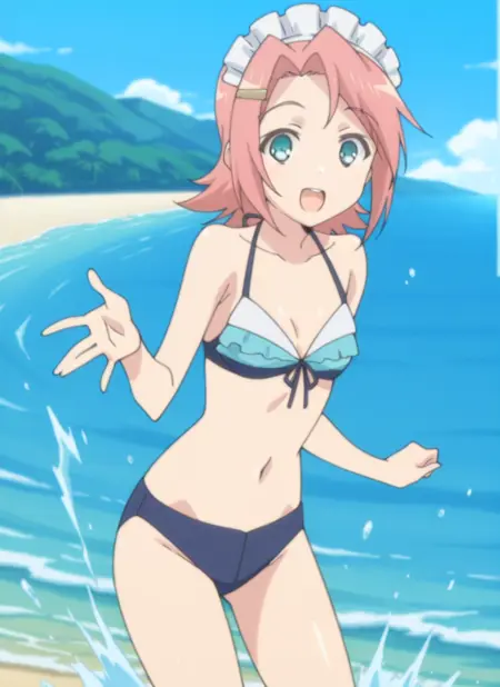 bikini, maid headdress, multi-colored top, navy blue bottom, aqua flip flops
