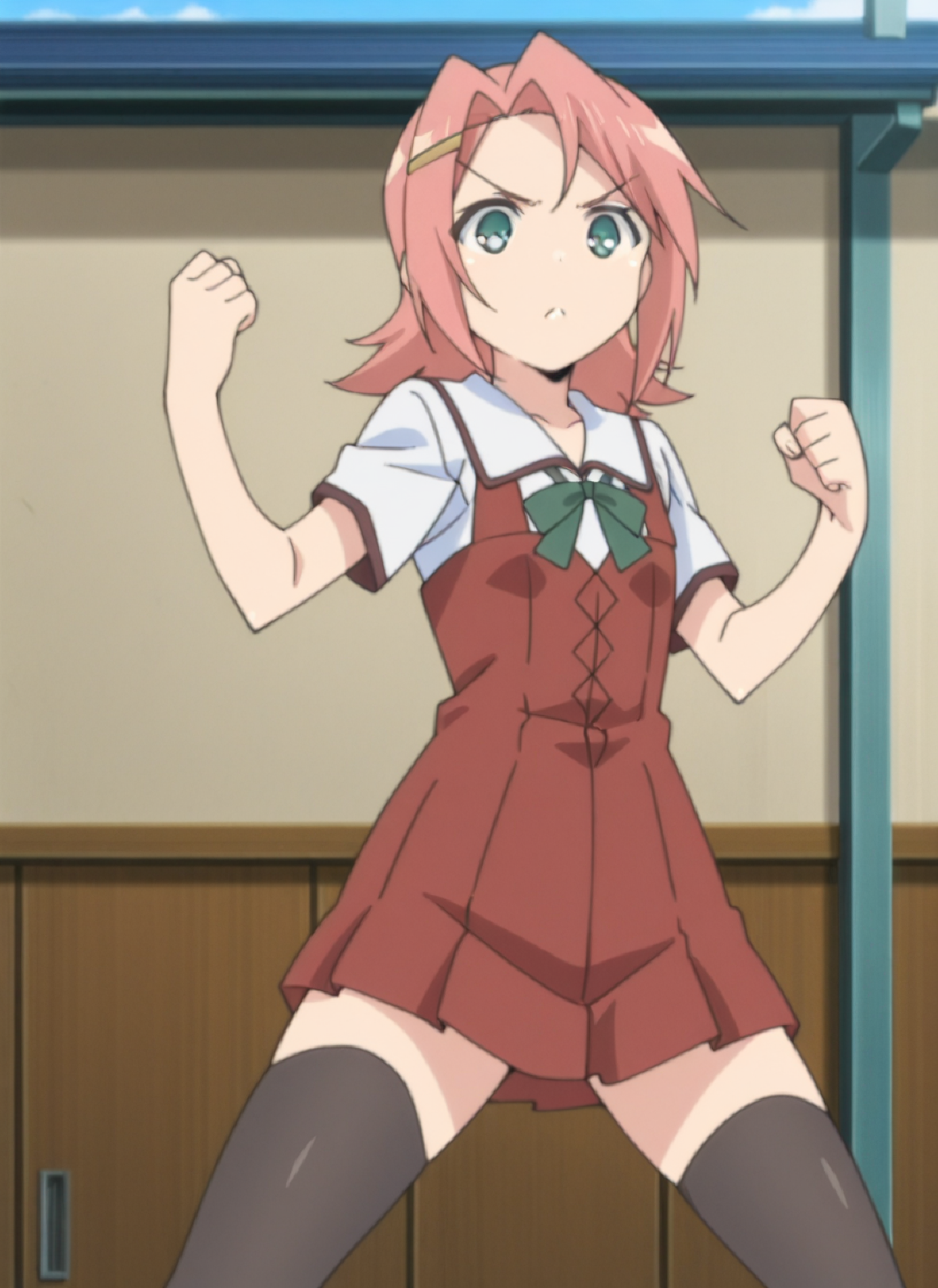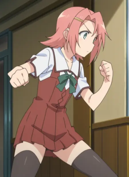 Kureha Sakamachi, pink hair, short hair, turquoise eyes, parted bangs, sidelocks, hairpin, anime screencap