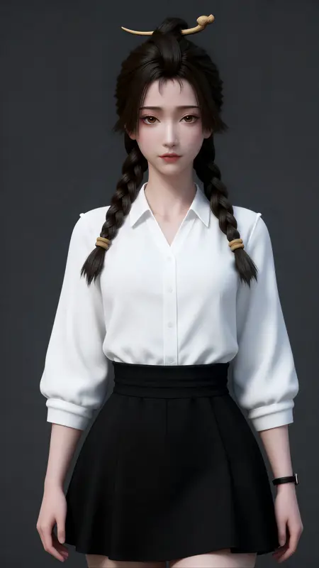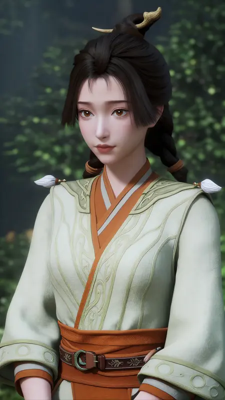 提示词:公孙杏, 一个女人, 两个辫子, 木头发簪, 黄色古代服装