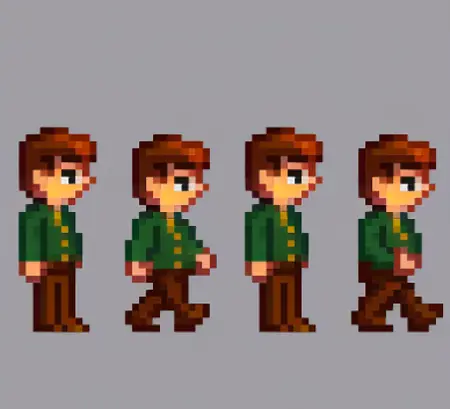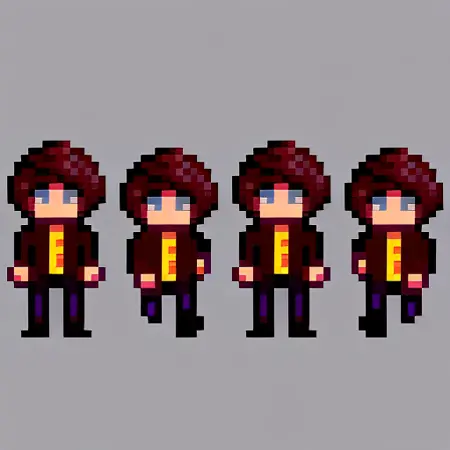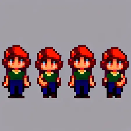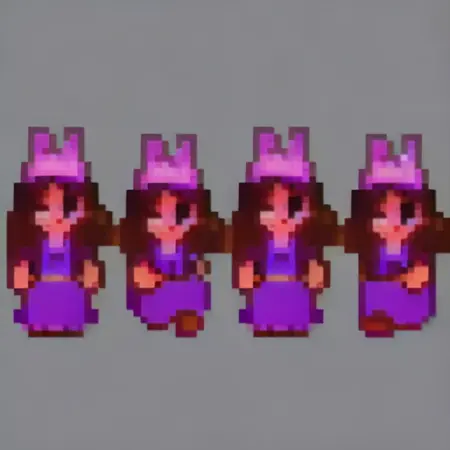 이 Stable Diffusion 체크포인트는 네 가지 다른 각도에서 픽셀 아트 스프라이트 시트를 생성할 수 있도록 해줍니다. 이 첫 번째 이미지들은 제 아내의 이미지로 학습된 다른 모델과 이 모델을 병합한 후 얻은 결과입니다. 각 시점에서 일관된 캐릭터를 얻는 가장 쉬운 방법은 다른 모델을 이 모델에 병합하는 것입니다. 원하는 결과를 얻기 위해서는 img2img의 설정을 조금 조정해야 합니다. 좌우 방향의 경우, 가장 좋은 결과를 선택한 후 반사하여 사용하는 것을 권장합니다. 만족할 만한 결과를 얻은 후, 사진을 Photoshop이나 Krita에 가져와 배경을 제거하고 원하는 크기로 조정하세요. 이후 결과를 표시하기 위해 다시 확대할 수 있으며, 이 과정을 통해 초기 출력물의 색상이 흐릿한 문제도 개선됩니다. 원래 Onodofthenorth가 Hugging Face에 게시한 내용입니다.