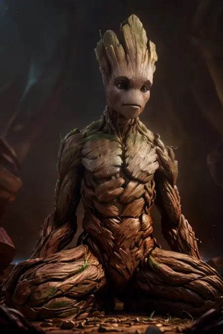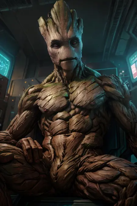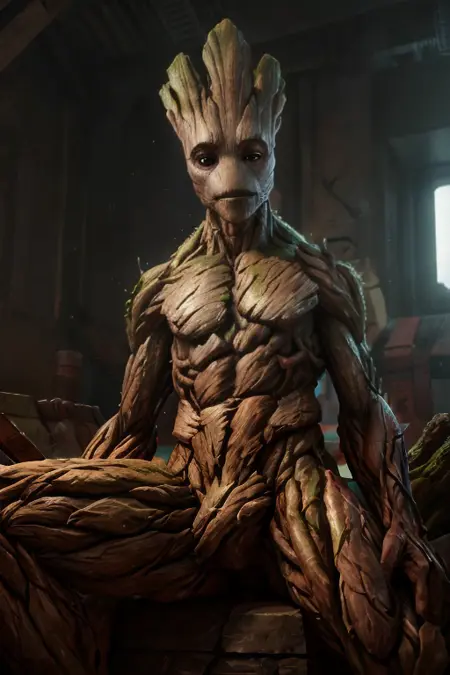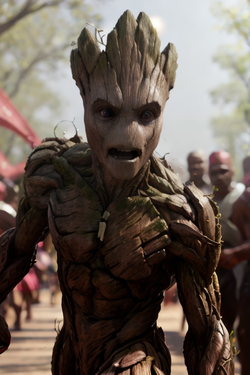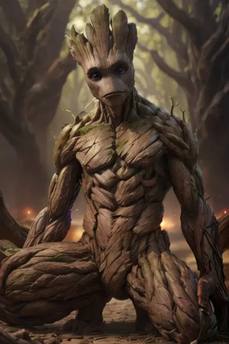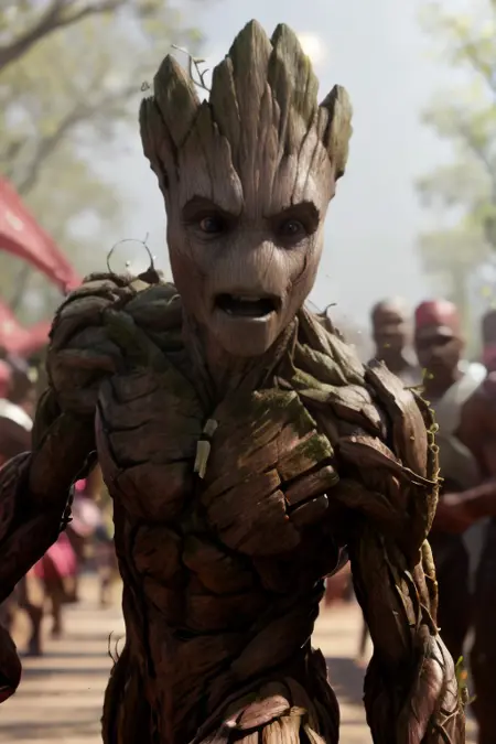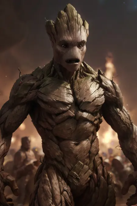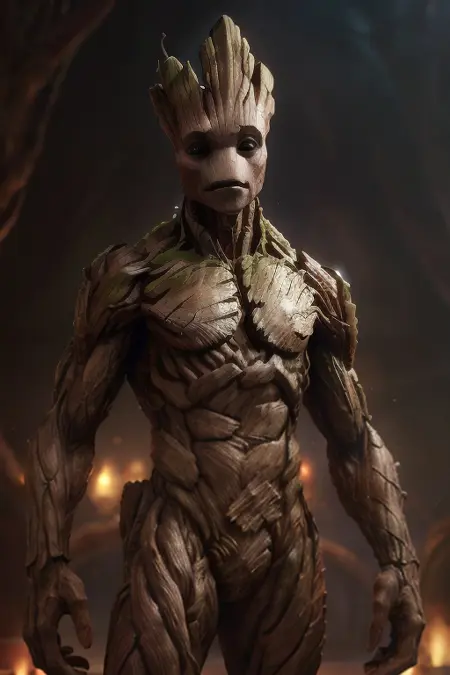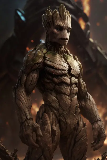 GrootAlpha,正面视角,(杰作),高细节,超写实,(成熟强壮的格鲁特),站立,模糊背景,快速,32k,注视观众
