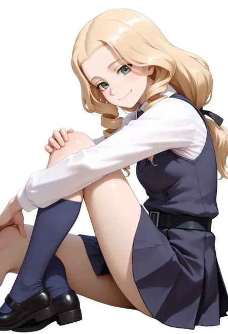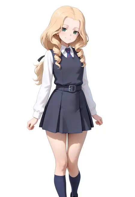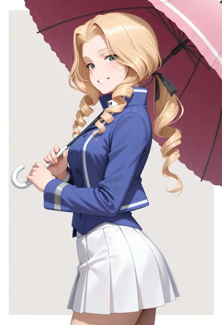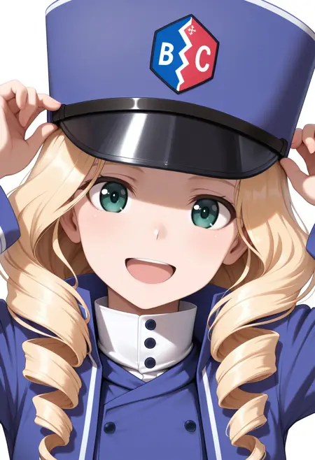トリガー: 1girl, solo, drill hair, blonde hair, low-tied long hair, green eyes, hair ribbon, black ribbon, bc freedom military uniform, military hat, blue headwear, kepi, long sleeves, white shirt, dress shirt, high collar, blue jacket, blue vest, pleated skirt, white skirt, miniskirt, bc freedom (emblem)