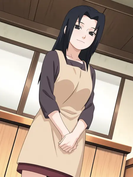 追加ワード:「長い髪、分け目のある前髪、黒い目、黒い髪、成熟した女性、エプロン、長袖、スカート」