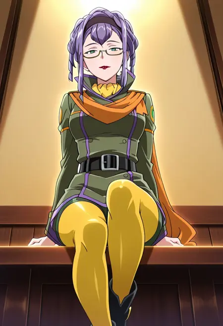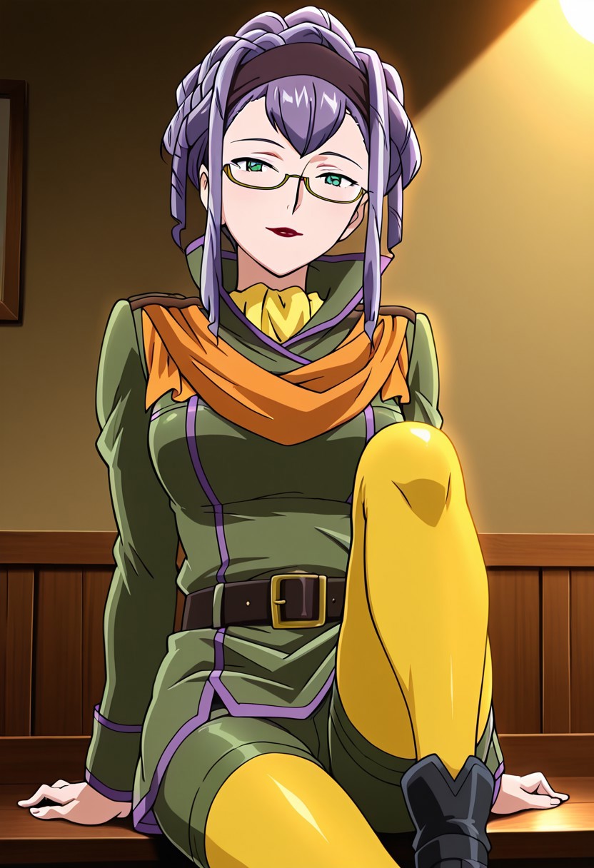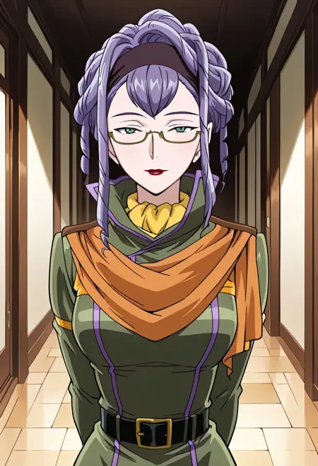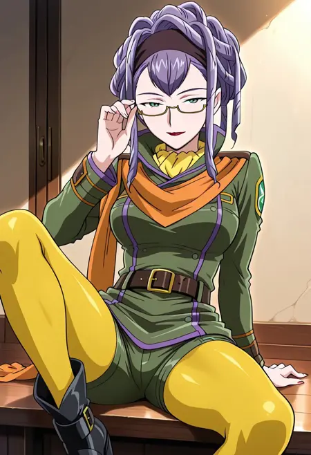 아나콘드, 1명의 성인 여성, 녹색 눈, 붉은 입술, 보라색 머리카락, 안경, 짧은 땋은 머리 스타일