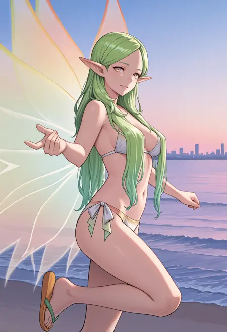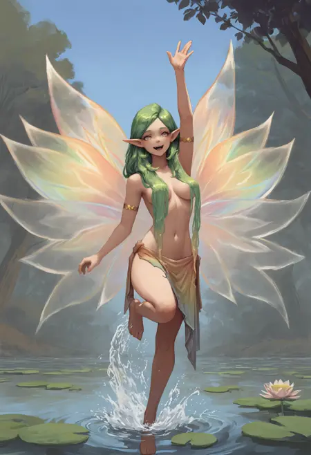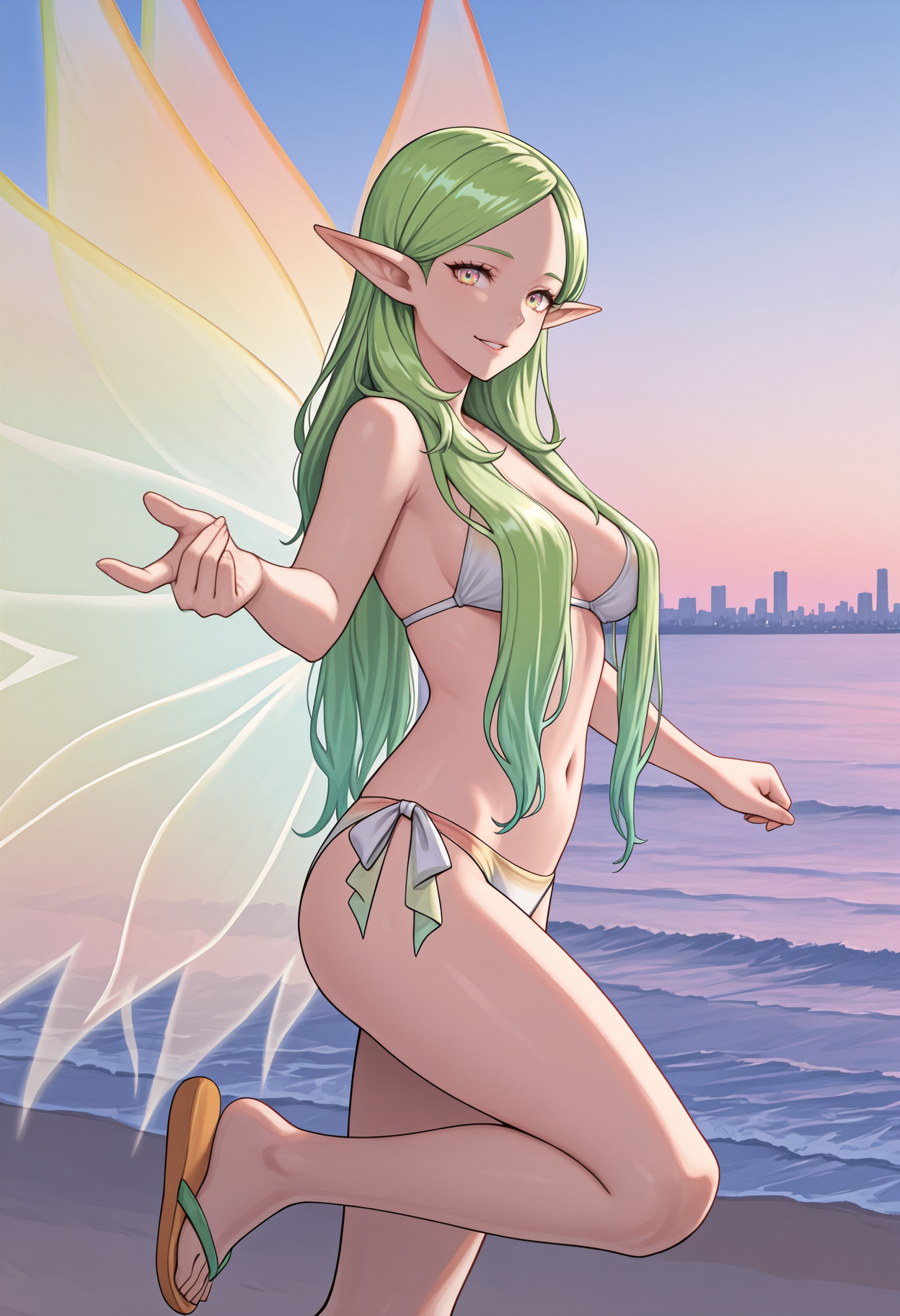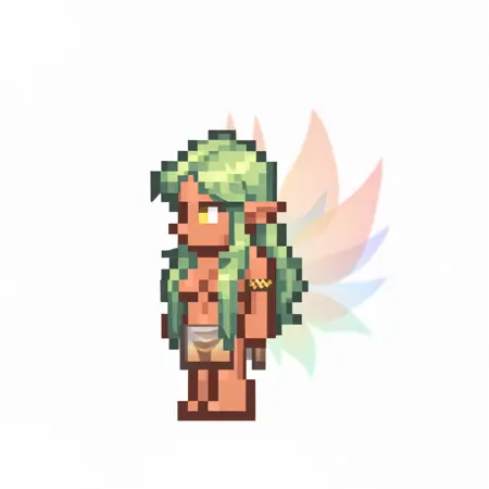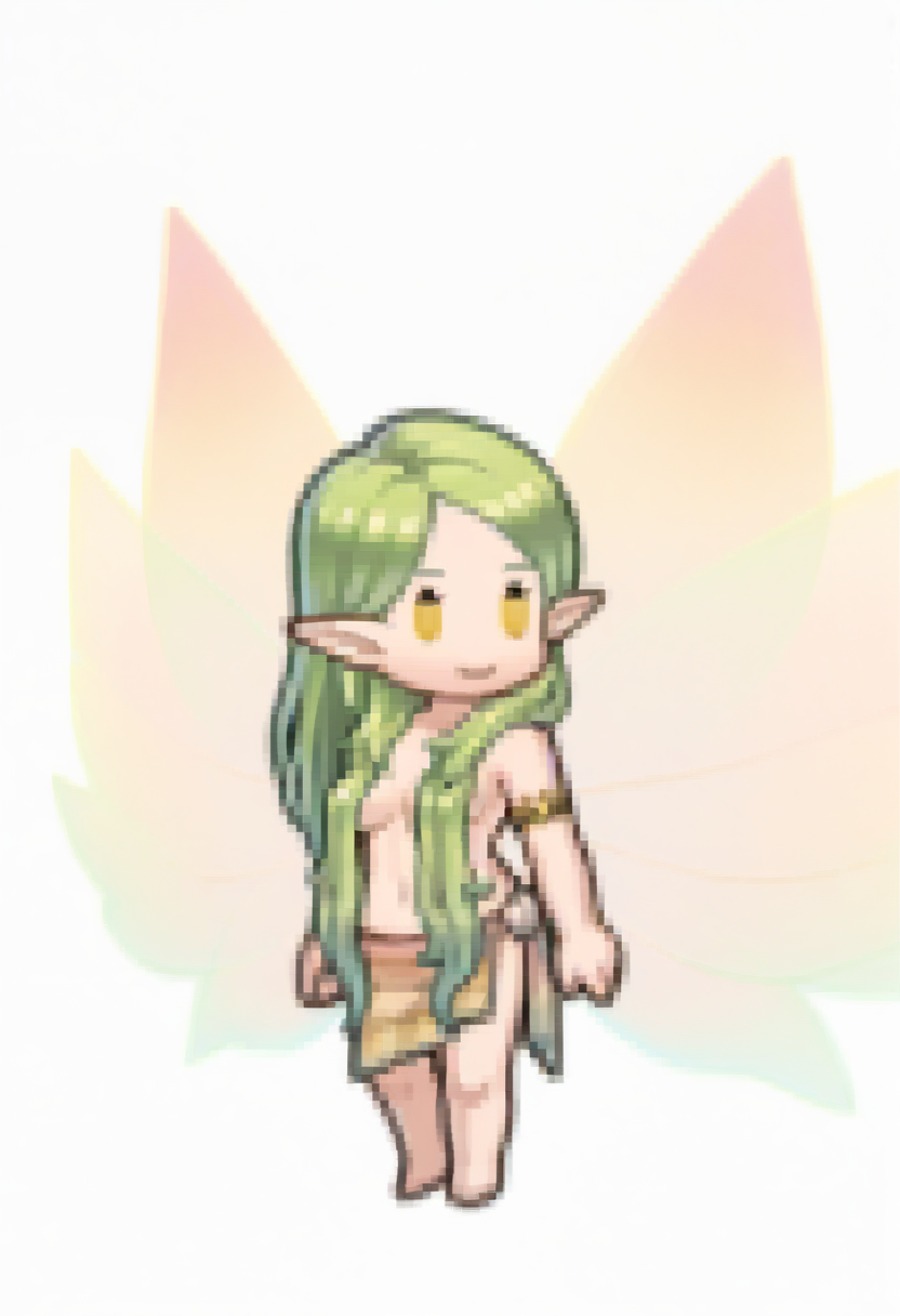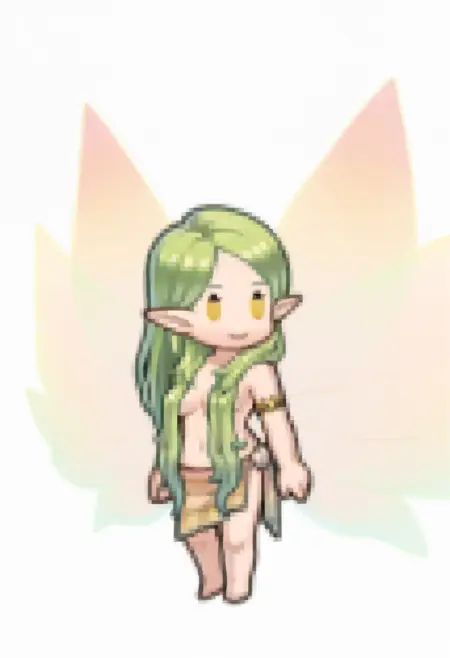 デフォルトの外見: 緑色の髪、尖った耳、長い髪、黄色い目、多色の目、上半身裸、髪で胸を隠す、妖精の翼、多色の翼、透明な翼、腕輪、腰巻き