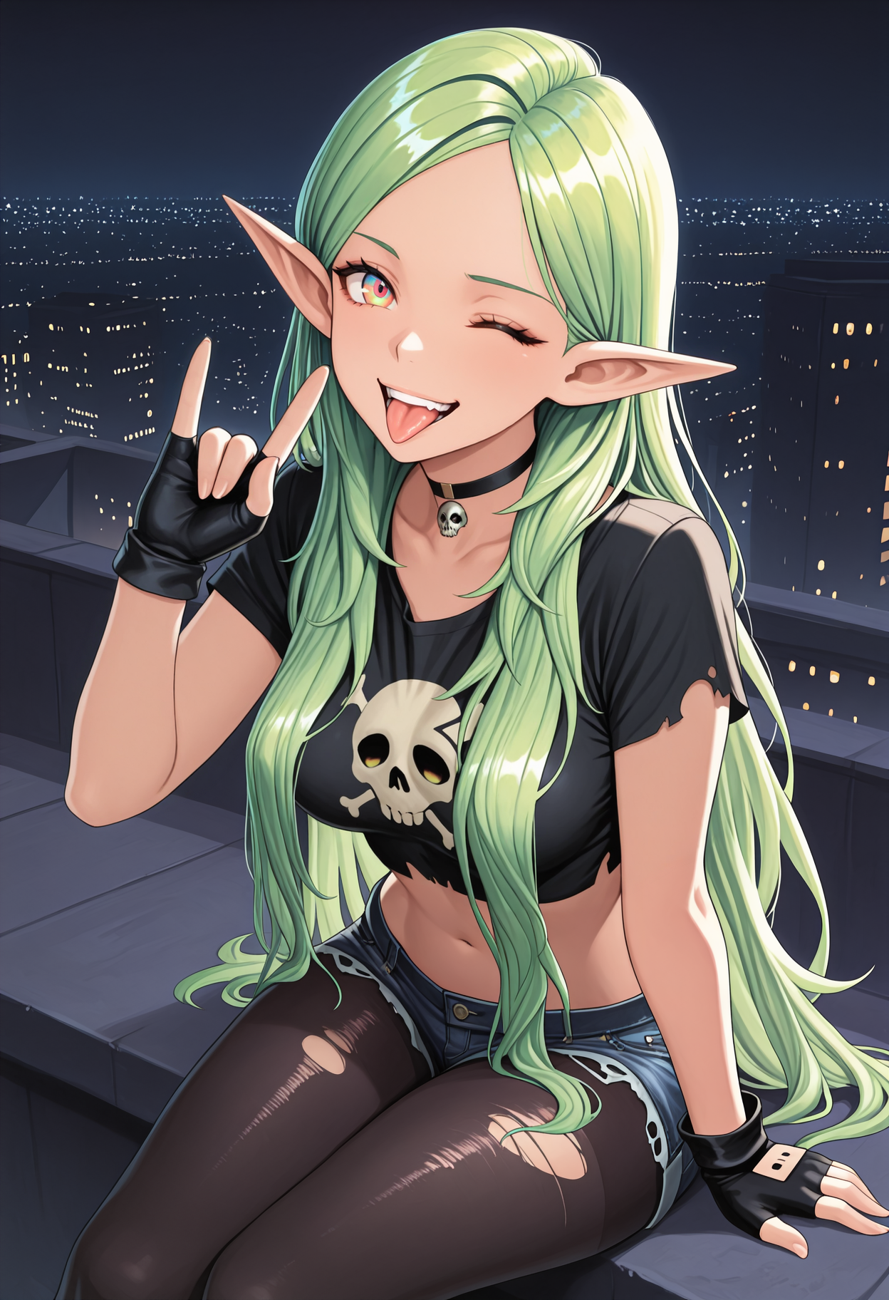 カスタム衣装: 緑色の髪、尖った耳、長い髪、黄色い目、多色の目、髪が胸を覆う