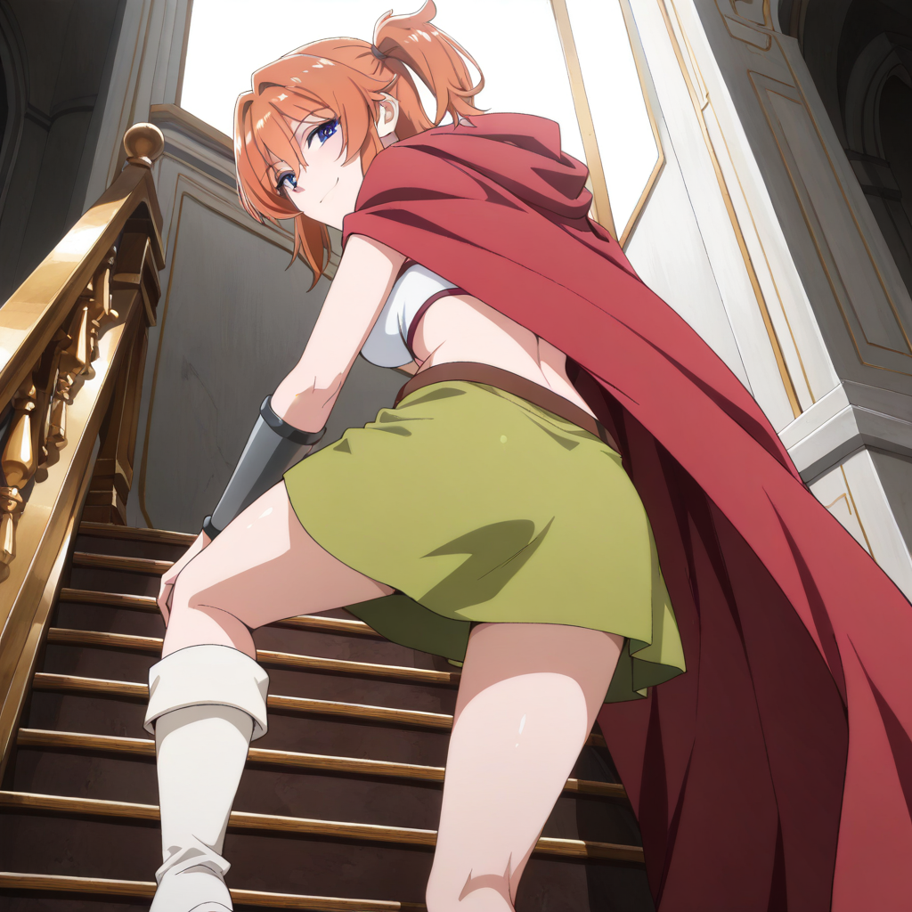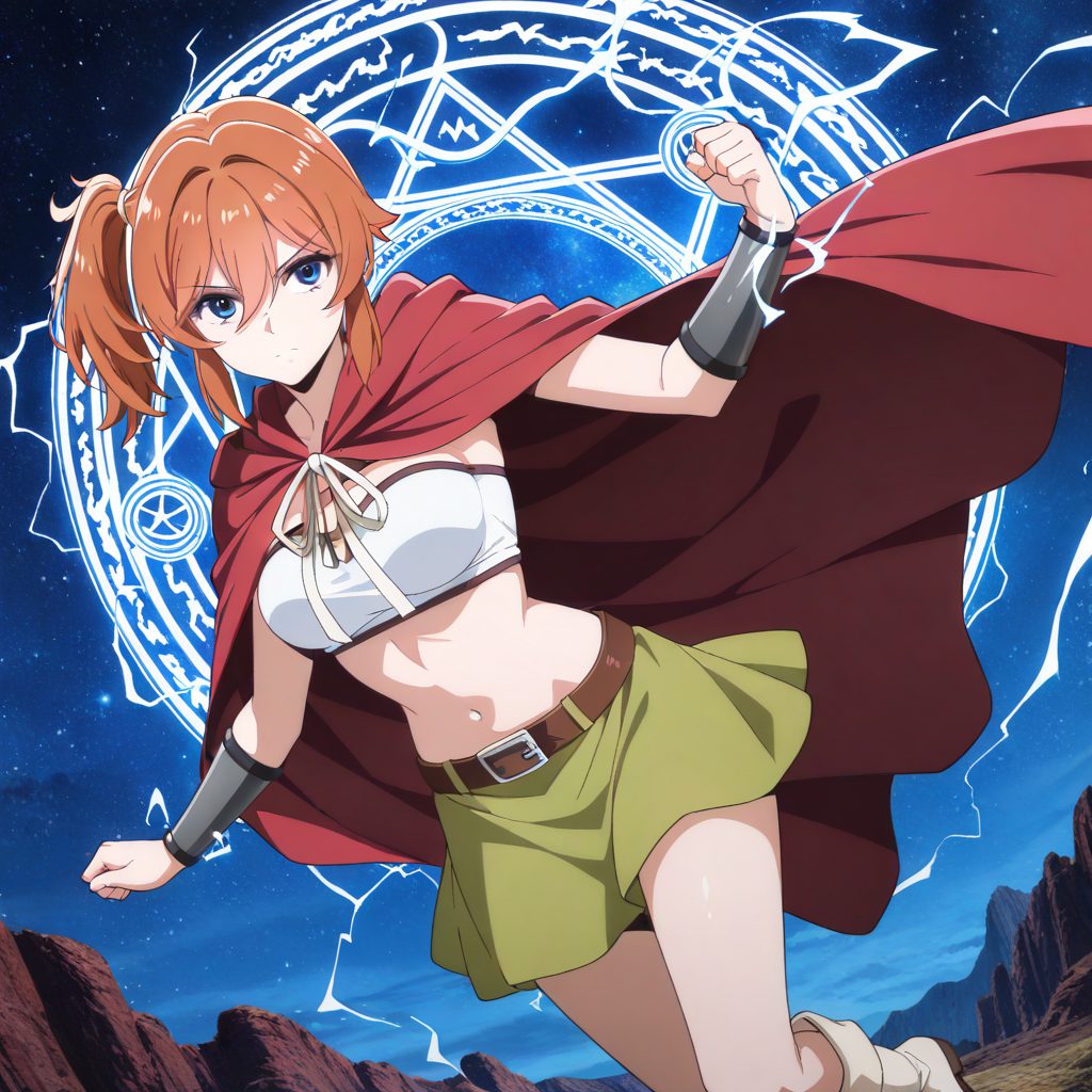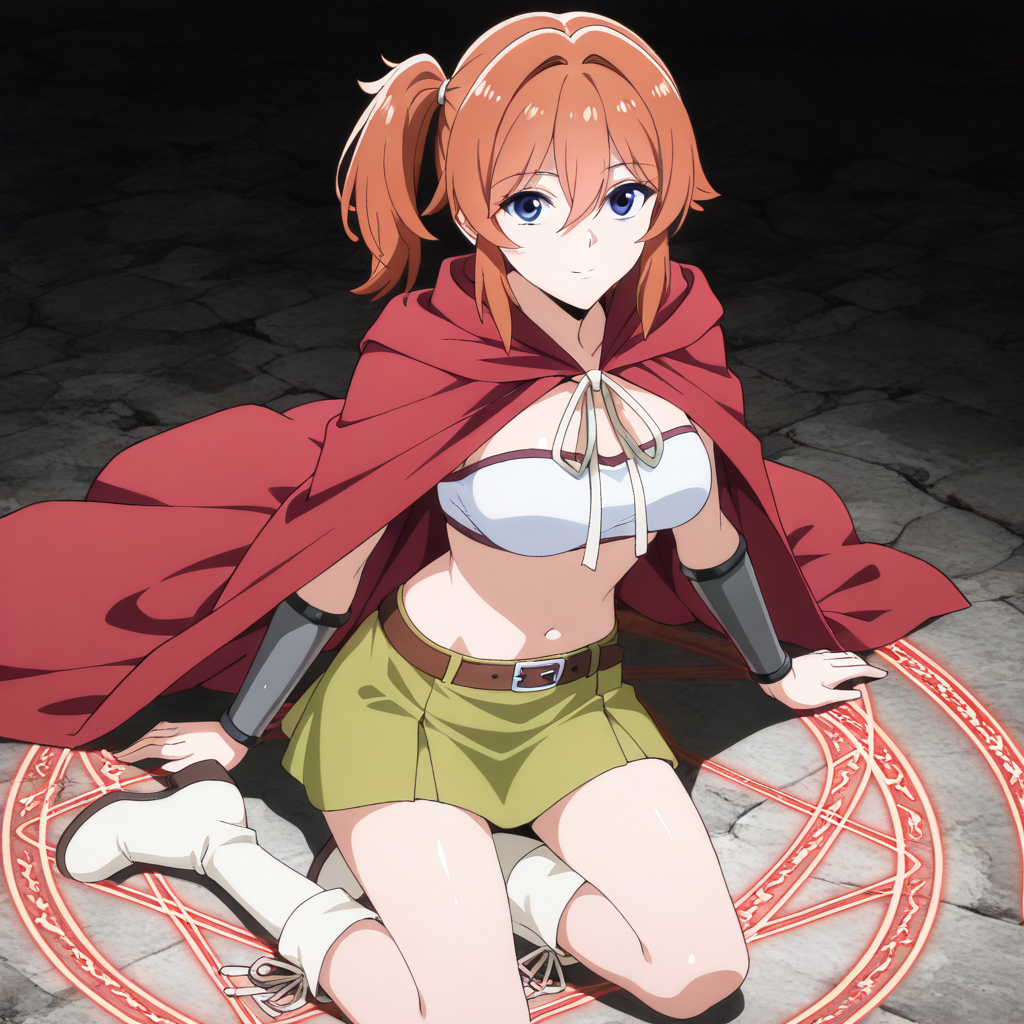 衣装: (赤いマント、白いリボン、白いミッドリフシャツ、緑のミニスカート、茶色のベルト、金属製のブレスレット、白いブーツ)