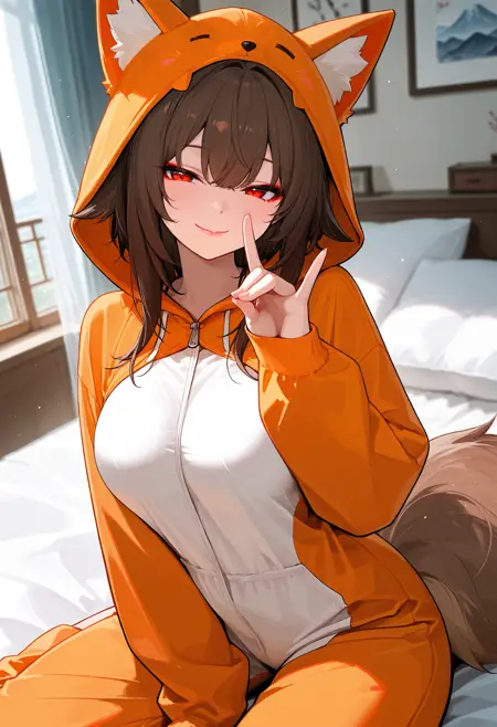 주요 태그: yeshunguang (zzz), 1girl, 갈색 머리카락, 더블테일, 측면 머리카락, 붉은 눈, 여우 꼬리, 허벅지 문신