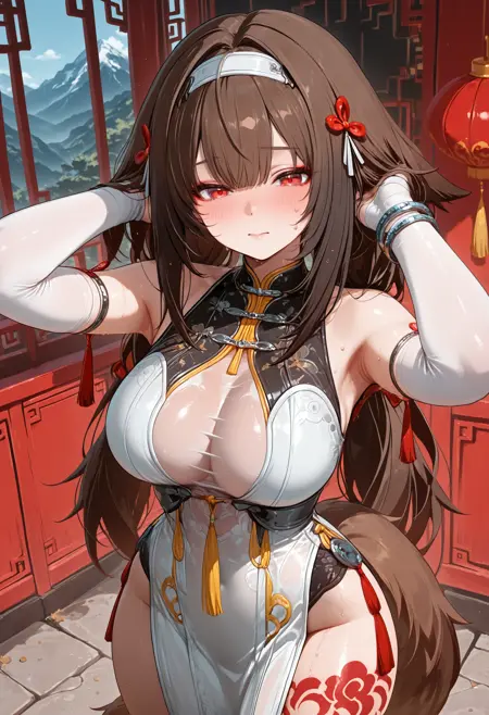 기본 복장: 흰색 머리띠, 머리 리본, 머리 장식, 중국식 드레스, 측면 슬릿, 투명한 가슴 부분, 손끝 장식, 골반 커튼, 어깨 노출, 팔꿈치 장갑, 팔찌, 보석, 검은 신발
