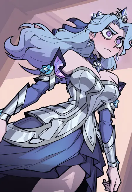 CR_Kaisa, 青髪, 長髪, 波状の髪, 紫色の目, クリスタルの冠, 片肩出しのドレス, 青と紫のドレス, メタリックな縁取り, アーマー風ボディースーツ, 袖, 白いストッキング, 透けるストッキング, ヒール