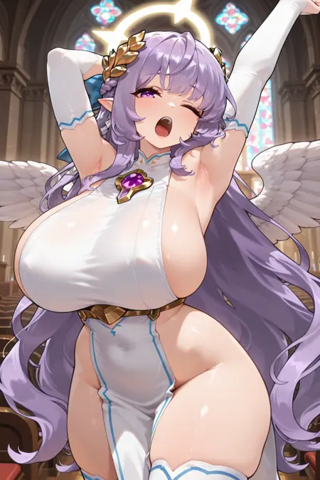 aestia6135, 紫色の髪, 非常に長い髪, 半分編み上げ, 青い目, ハロー, ローレル冠, 尖った耳, 髪飾り, 青いリボン,