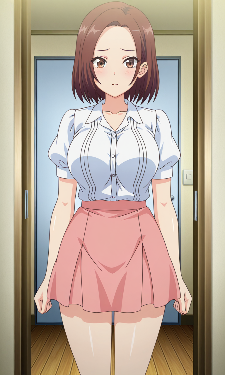 스커트, 셔츠, 관자놀이, 흰 셔츠, 짧은 소매, 불룩한 소매, 불룩한 짧은 소매, 분홍 스커트, 칼라 있는 셔츠, 미니 스커트, 드레스 셔츠, 분홍 스커트,