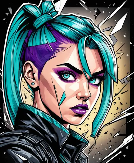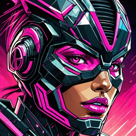 スタイル化された、角張った、セルシェーディング、太い輪郭イラスト、グラフィックインクスタイル、セグメント化されたアーマー幾何学、スタイル化されたシェーディング平面、高コントラストインクの影、刃のようなハイライトエッジ、ネオンアクセントディテール、コミックエネルギーの美学、面で構成された髪の形状