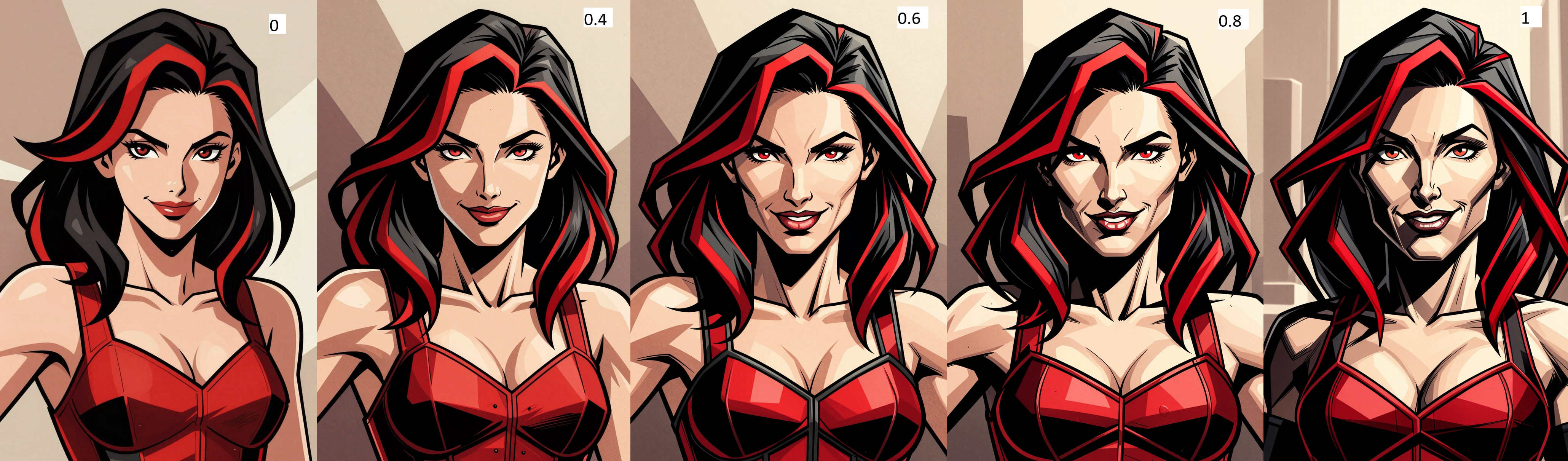 Flux LoRA 强度:0.5 – 2.0 用于锐角夸张