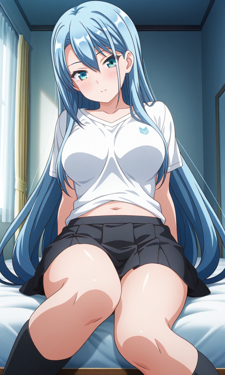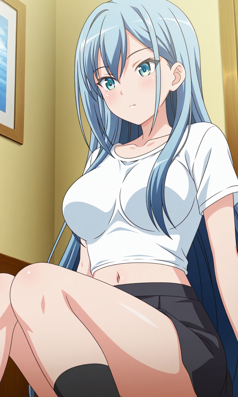 Miku Sugisawa (Chiisana Tsubomi no Sono Oku ni), 1girl, solo, long_hair, blue_eyes, aqua_eyes, light_blue_hair, breasts, medium_breasts, very_long_hair, bangs, sidelocks, hair_between_eyes, ponytail, large_breasts, navel, Thighs, anime_screencap,