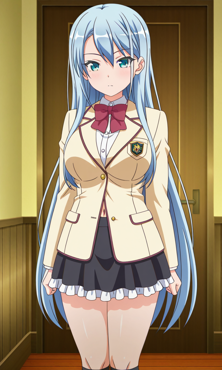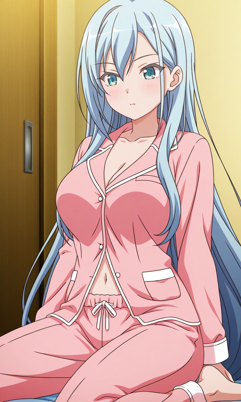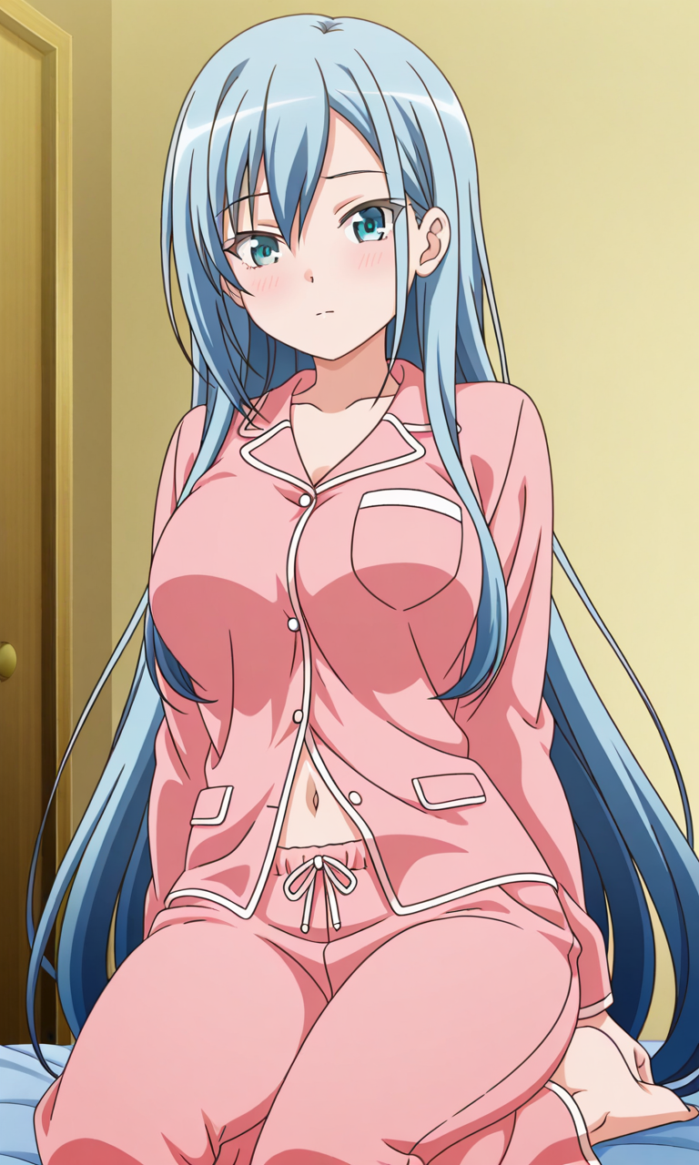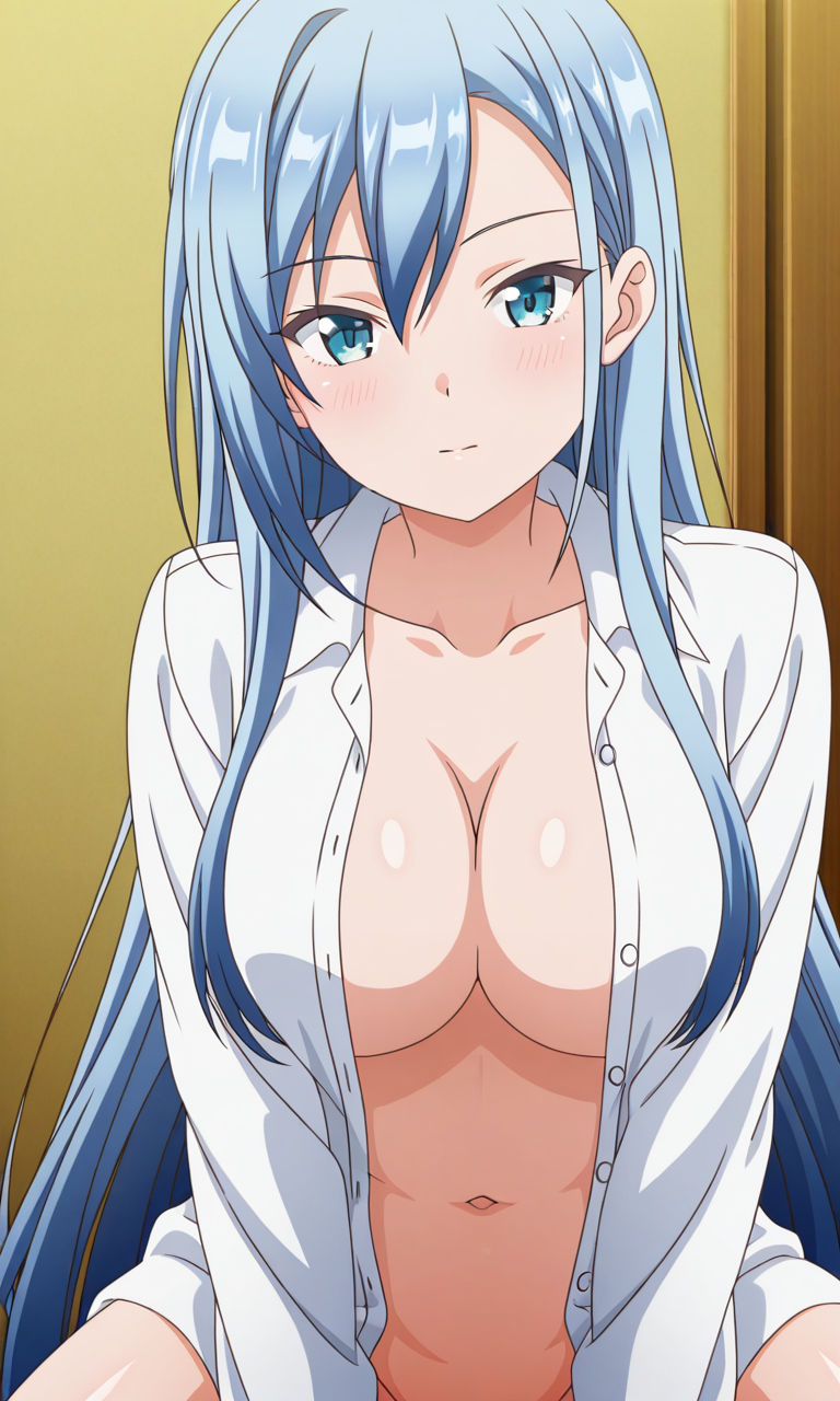 Miku Sugisawa (Chiisana Tsubomi no Sono Oku ni), 1girl, solo, long_hair, blue_eyes, aqua_eyes, light_blue_hair, breasts, medium_breasts, very_long_hair, bangs, sidelocks, hair_between_eyes, large_breasts, navel, Thighs, anime_screencap,