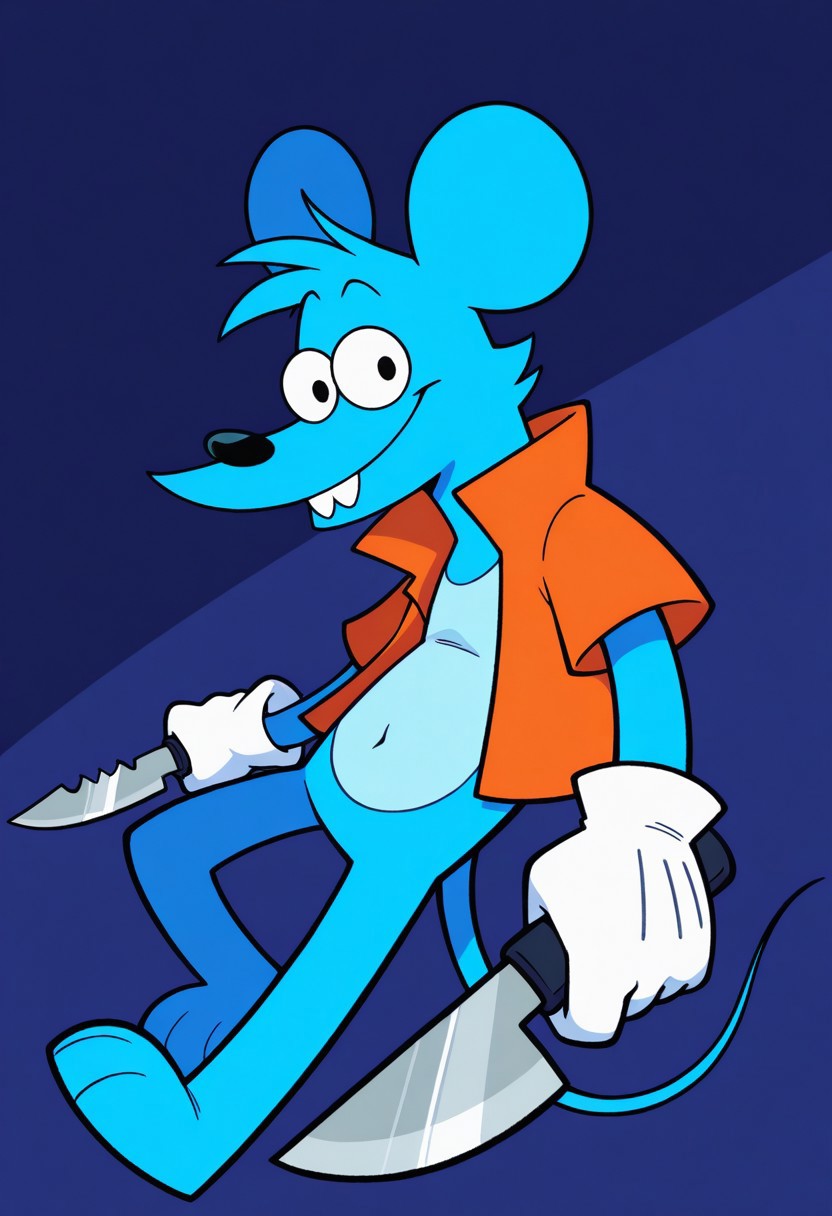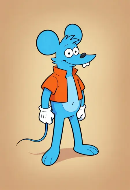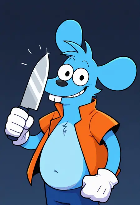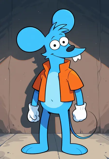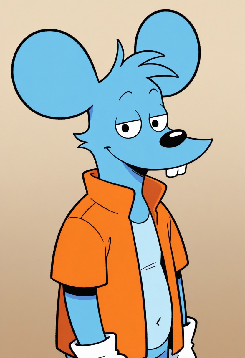 Solo,male,anthro mouse,blue fur,light-blue stomach,black nose,black eyes,orange jacket,short sleeves,head tufts,one bucktooth,no eyebrows,open jacket,white gloves