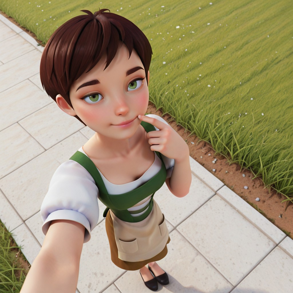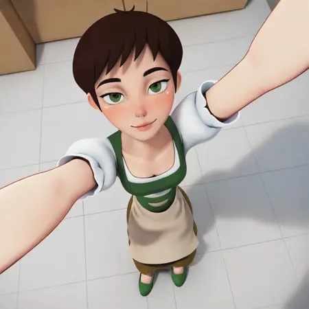 ell_hna, brown hair, short hair, green eyes, dress, apron, shoes