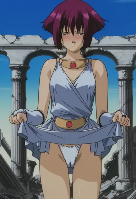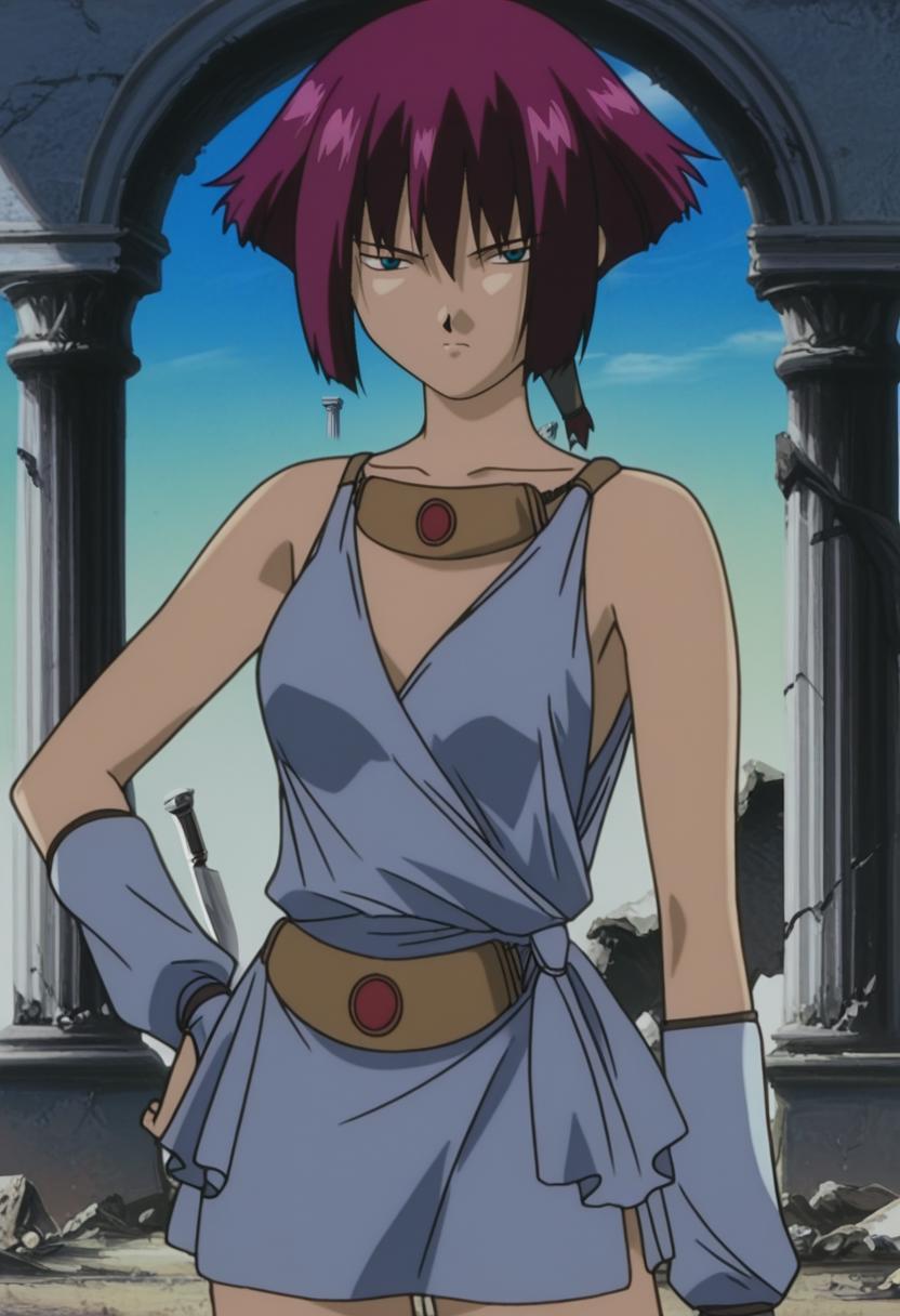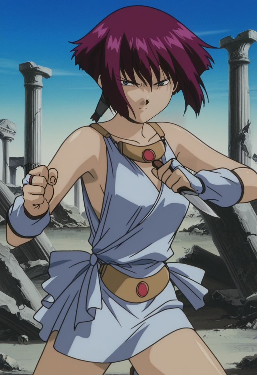 ChloeCeremony, 레트로 아트스타일, 1990년대 \(스타일\), 1girl, solo, 보라색 머리, 포니테일, 측면 머리카락, 단발, 회색 눈, 칼, 신부용 장갑, 칼을 들고, 흰 드레스, 어깨 노출, 짧은 드레스, 소매 없음, 팔보호대, 보석, 목걸이, 벨트, 레그워머, 샌들,