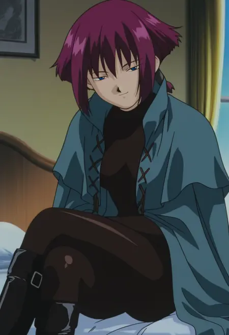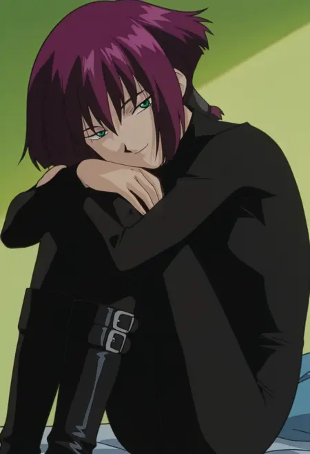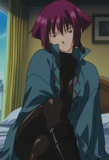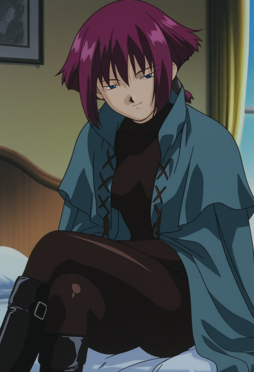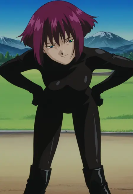 ChloeAs, 레트로 아트스타일, 1990년대 \(스타일\), 1girl, solo, 보라색 머리, 포니테일, 측면 머리카락, 단발, 회색 눈, 부츠, 바디수트, 무릎부츠, 검은 신발,