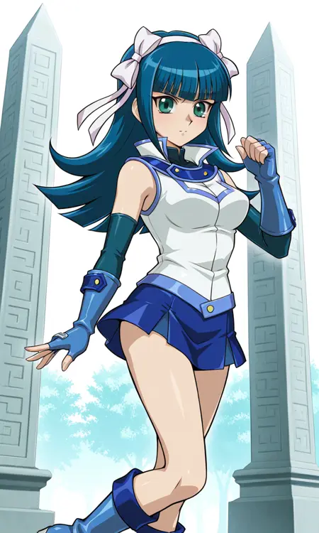 blue footwear, blue gloves, blue skirt, boots, Obelisk Blue, duel academy uniform (yu-gi-oh! gx), elbow gloves, fingerless gloves, gloves, jacket, miniskirt, skirt, sleeveless, sleeveless jacket, sleeveless shirt, white jacket, bare shoulders,