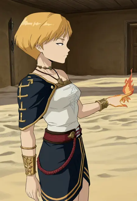 服装: 项链、吊带上衣、单件斗篷、衣物文字、单臂铠、多个戒指、裹裙、及膝靴