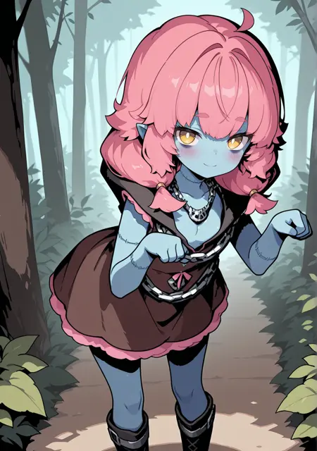 recommend:pink hair,yellow eyes,ahoge,medium hair,low twintails,white pupils,thick eyebrows,pointy ears,blue skin,colored skin,short dress,brown dress,frilled dress,sleeveless dress,black footwear,chain,knee boots,hood,jewelry,