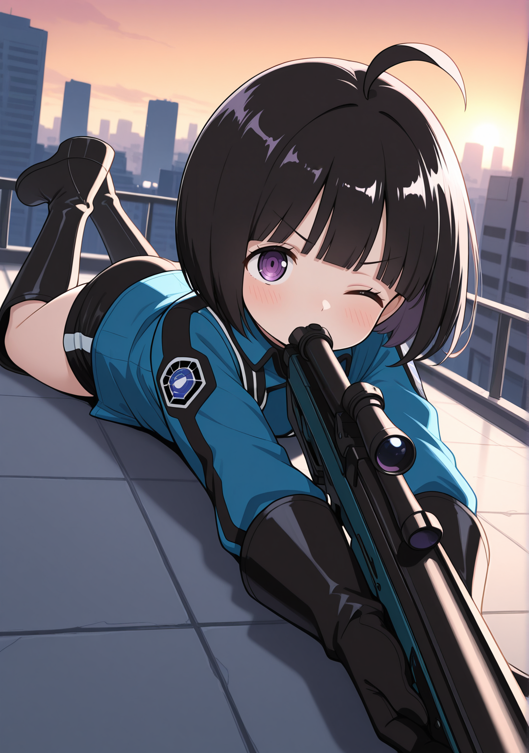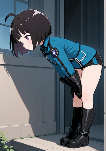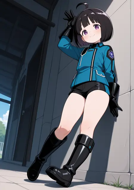 推荐:黑发,紫眼,短发,呆毛,齐刘海,鲍伯头,蓝色夹克,长袖,短裤,黑色短裤,黑色手套,黑色鞋履,及膝靴,