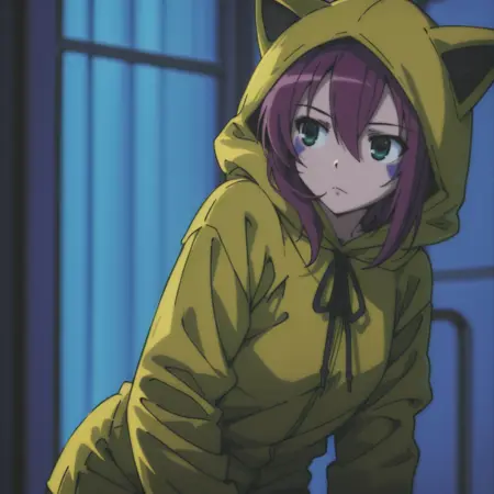 후드 자켓이 있는 버전 트리거: MerryHoodedJacket, 1소녀, 녹색 눈, 동물 후드, 보라색 머리카락, 얼굴 무늬, 노란색 레인코트, 후드, 단발, 카우보이 샷