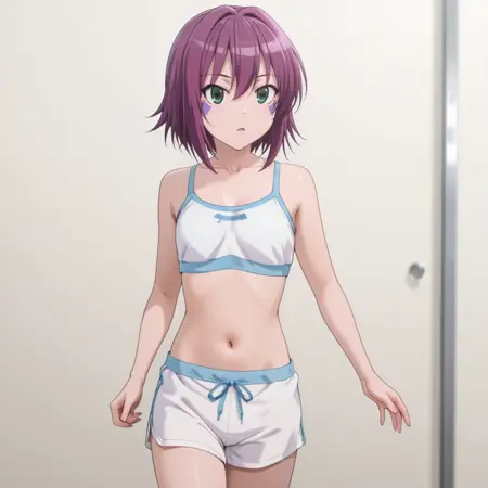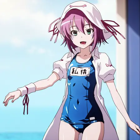 수영복이 있는 버전 트리거: MerrySwimsuit, 1소녀, 학교 수영복, 원피스 수영복, 보라색 머리카락, 모자, 녹색 눈, 단발, 송곳니, 얼굴 무늬, 리본, 카우보이 샷