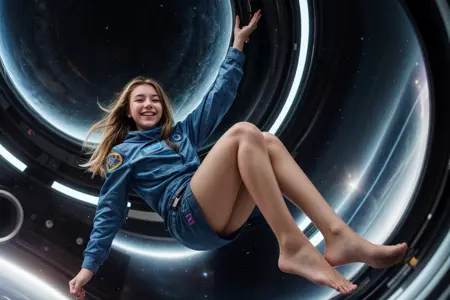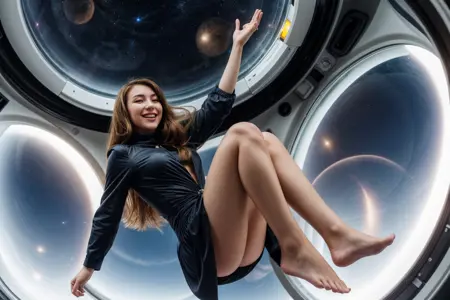 프롬프트: 공중에 떠있음, 우주선 안에서, 중력이 없는 우주,