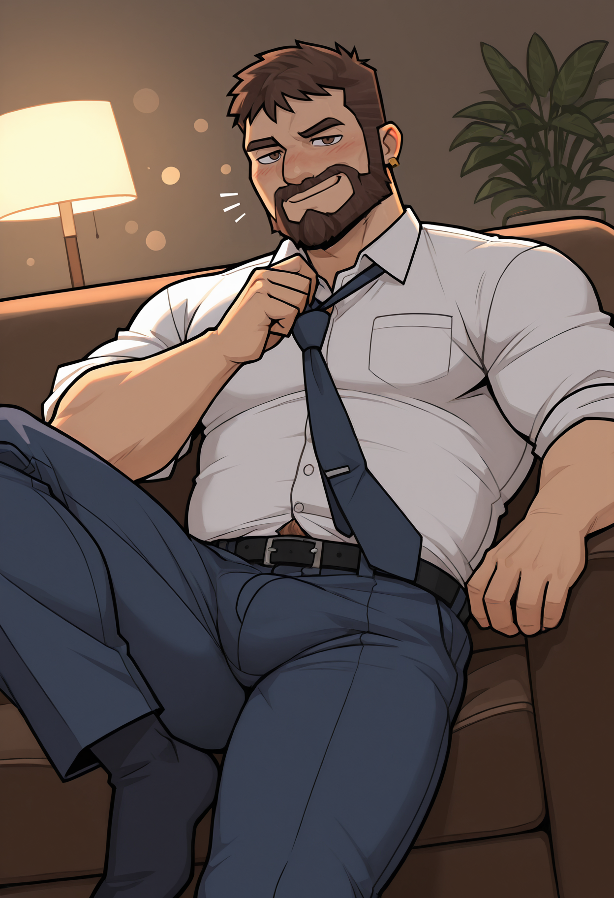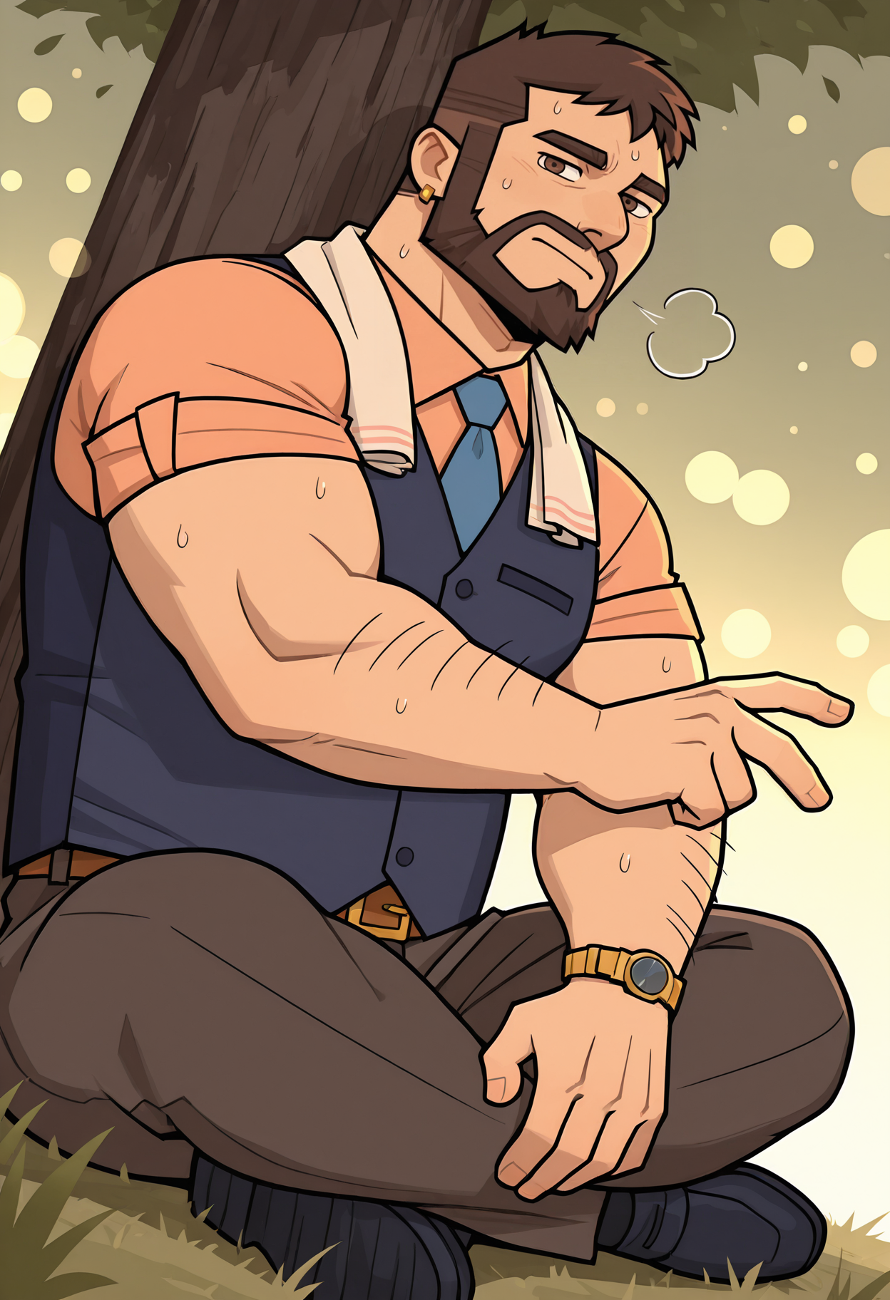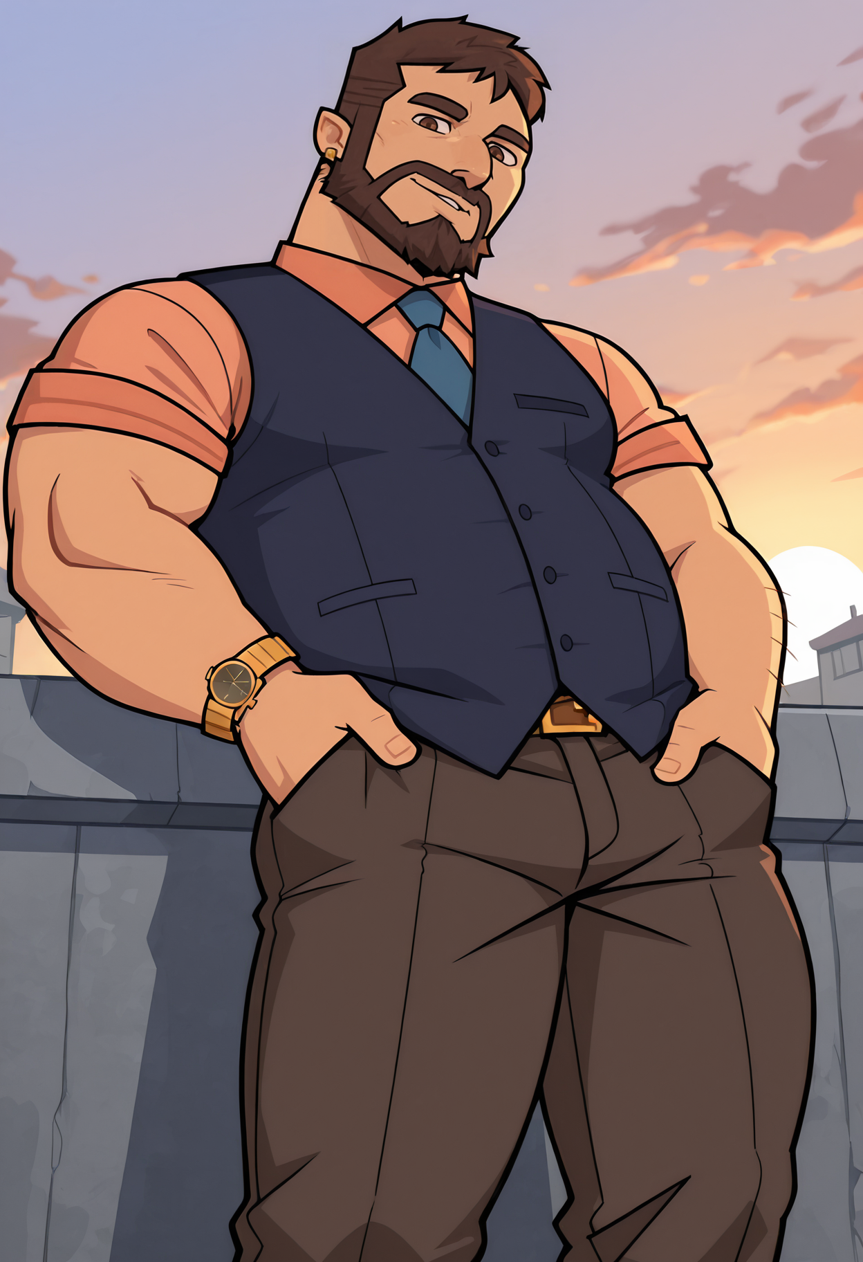 桃色衬衫, 深蓝色背心, 蓝色领带, 深棕色长裤, 金色腰带扣, 金色手表,