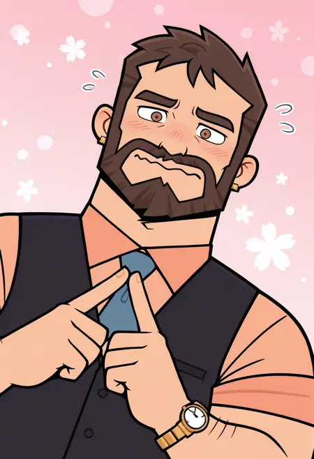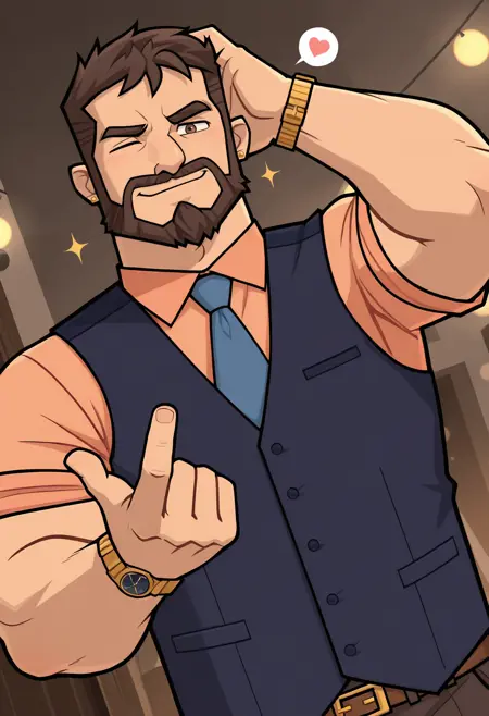 peach colored shirt, dark blue vest, blue tie, dark brown pants, gold belt buckle, gold watch,
