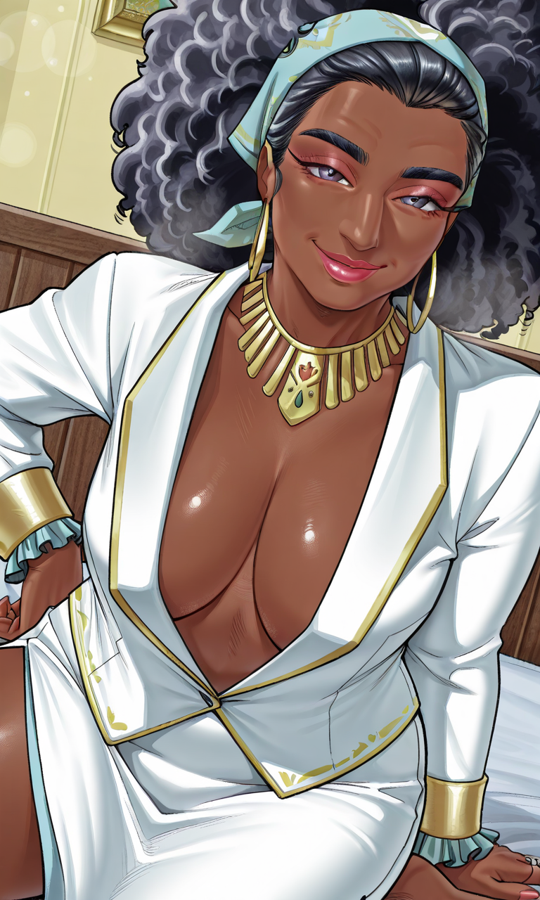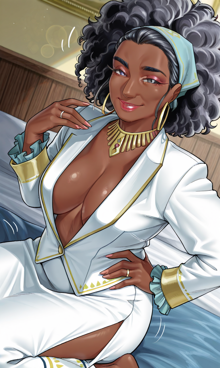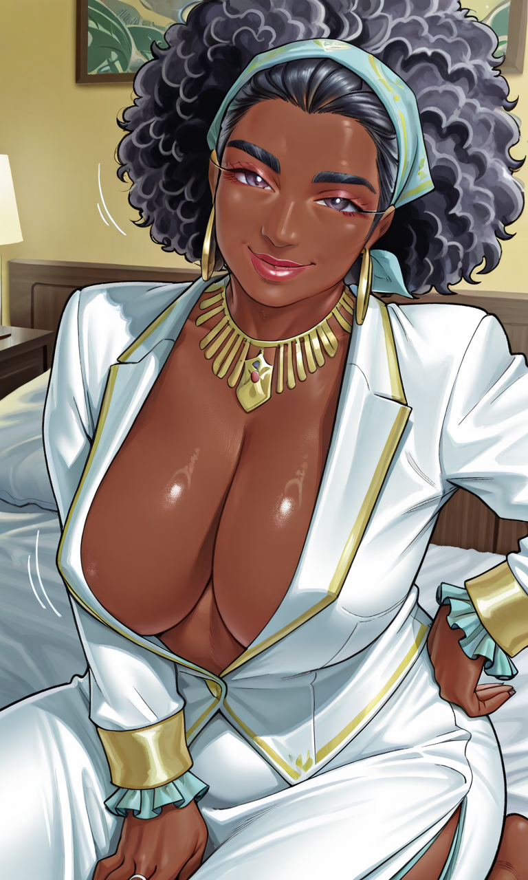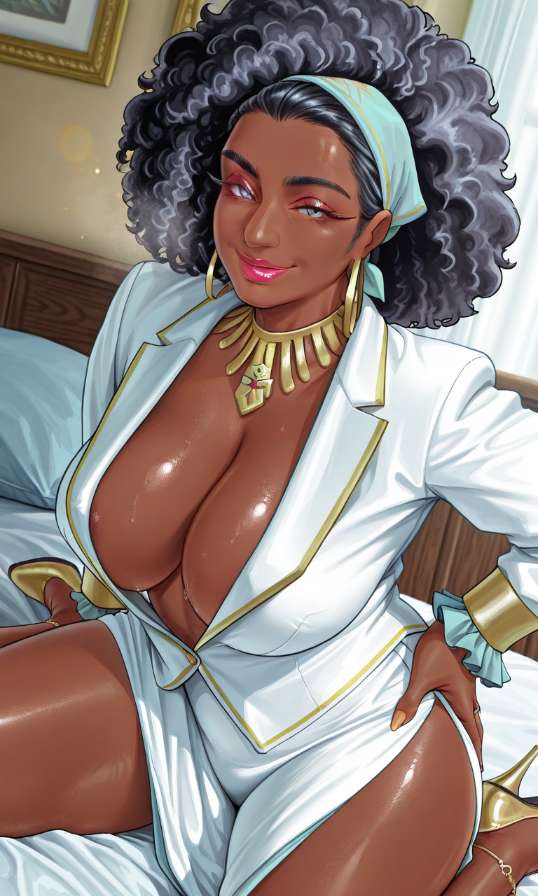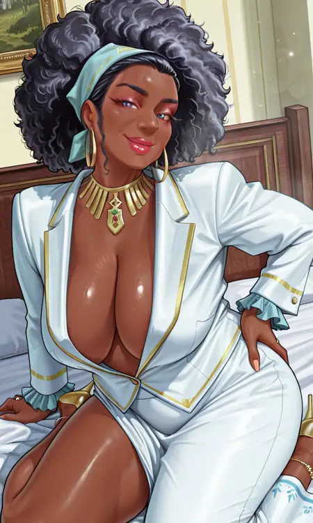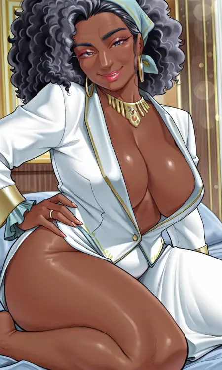 주름, 성숙한 여성, 흑인, 1명의 여자, 검은 피부, 검은 피부 여성, 매우 검은 피부, bellarkd, 코, 입, 큰 헤어, haircut1, 곱슬머리, 아프로, 검은 머리, 뒤로 묶은 머리, 밴다나, 메이크업, 립스틱, 귀걸이, 보석, 목걸이, 금 목걸이, 금 귀걸이, 반지, 환형 귀걸이, 팔찌, 흰색 정장, 흰색 재킷, 깊은 네크라인, 프릴 소매, 프릴, 정장, 흰 치마, 긴 치마, 치마, 옆 슬릿, 정식, 거대한 가슴, 처진 가슴, 젖가슴, 브라 없음, 유두 노출, 두꺼운 허벅지, 발목장식, 스틸레토 힐, 금색 신발, 플랫폼 힐,