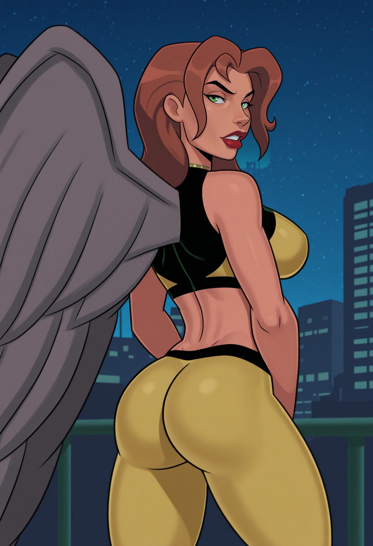 shayera_su_main_outfit, bare shoulders, midriff, crop top, navel, pants, yellow pants,