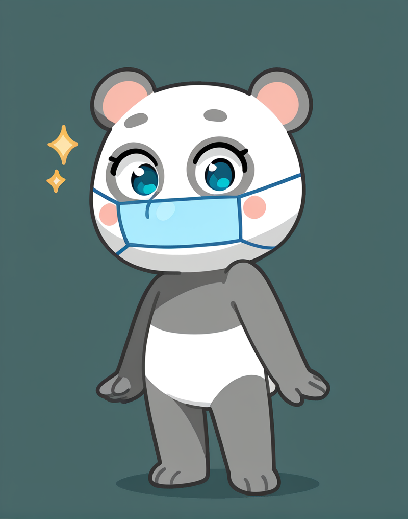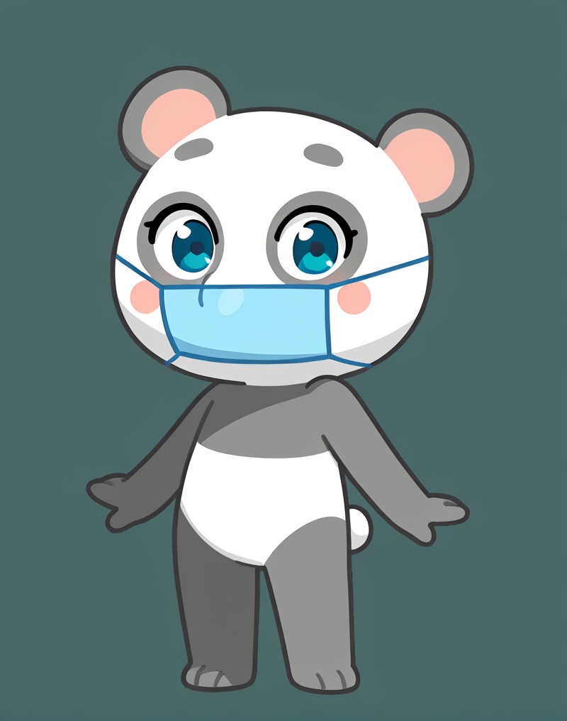PandaMiaVK, giant panda, white and gray fur, two-tone fur, blue eyes, blush, surgical mask, panda ears, chibi, furry female, furry, 1girl