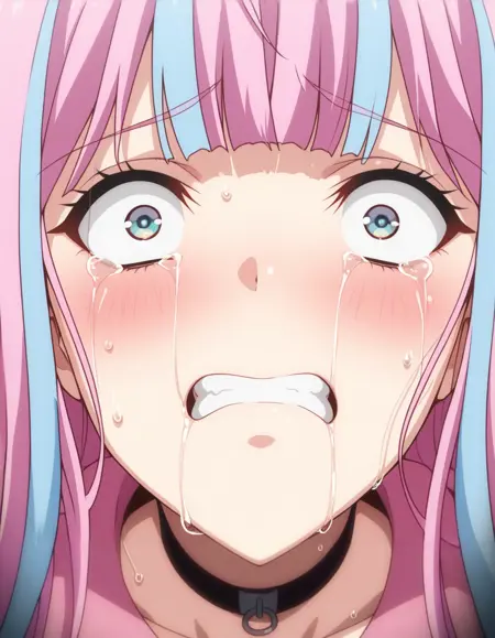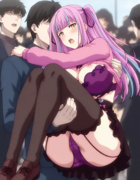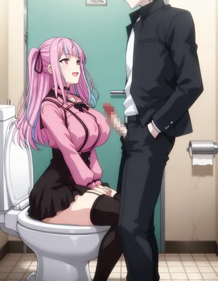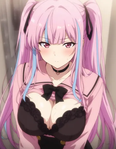 mai_rimikag3,long_hair,blunt_bangs,two_side_up,pink_hair,streaked_hair,blue_hair,green_eyes,large_breasts,hair_ribbon,choker,pink_sailor_collar,shirt,skirt,pink_shirt,long_sleeves,suspender_skirt,black_skirt,garter_straps,black_thighhighs,black_boots,high_heels