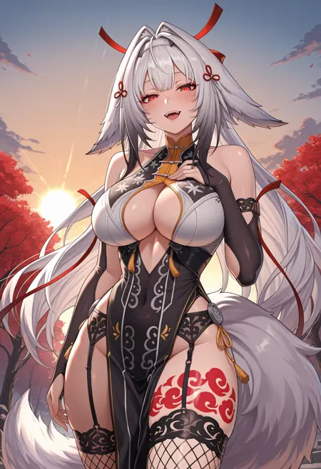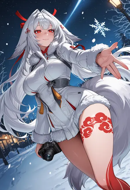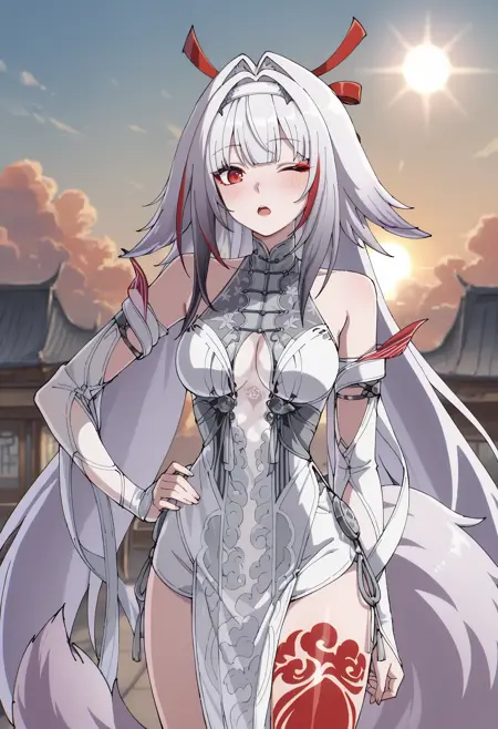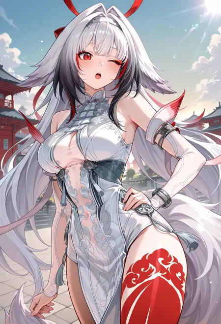 Alter: ye-shunguang (character), 1girl, red eyes, white hair, very long hair, fox ears, droopy ears, white hairband, hair intakes, alt_hair_ornament, alt_fox tail, alt_leg tattoo