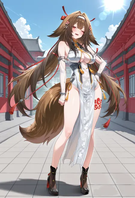 Basic: ye-shunguang (character), 1girl, red eyes, brown hair, very long hair, fox ears, droopy ears, white hairband, hair intakes, hair ornament, fox tail, leg tattoo