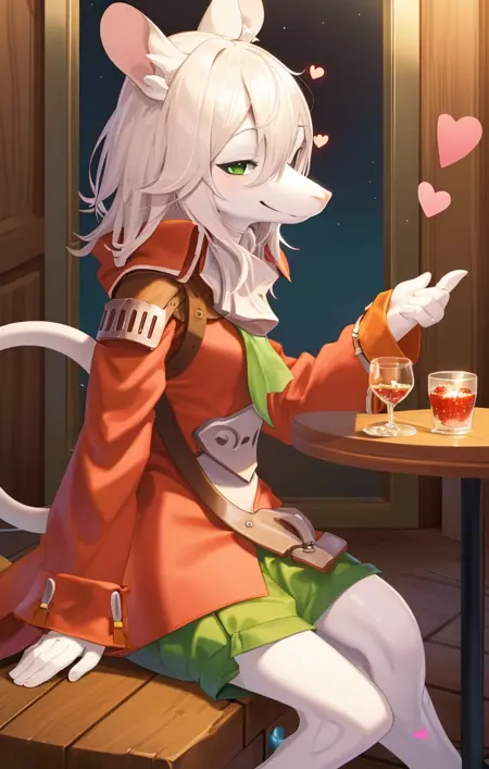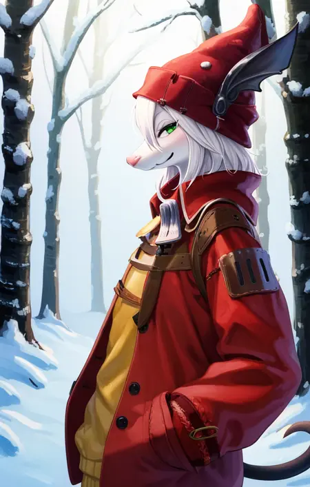 「フレイア・クレセント(ファイナルファンタジー)、ふわふわの女性、マウスのような鼻、赤い頭飾り、赤いジャケット、ハムスタービッチ、緑の目」が、通常の服装用の例としてご活用ください。