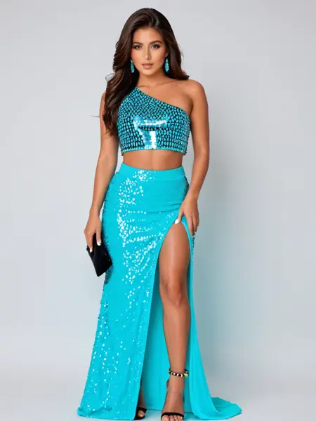 전기적인 실루엣: 컷아웃 밴디지 드레스, 액체 같은 금색 점프수트, 허벅지까지 높게 절개된 투명 메쉬 맥시 드레스를 특징으로 합니다. 의상은 광택 있고 몸에 딱 붙습니다.